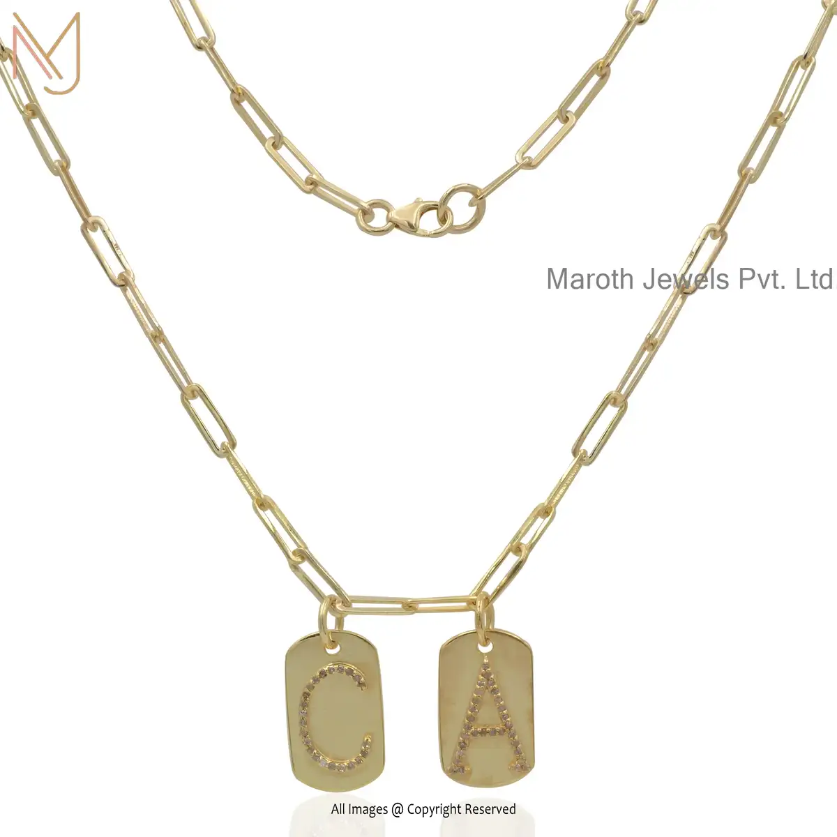 14k Gold Plated 2 Letter Dog Tag Pendant & Paperlip Chain Necklace With Clasp Jewelry USA