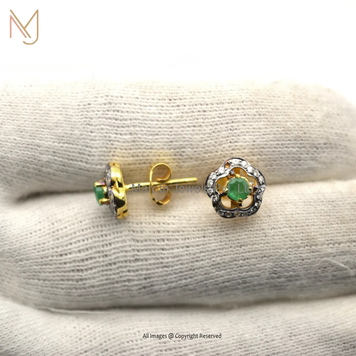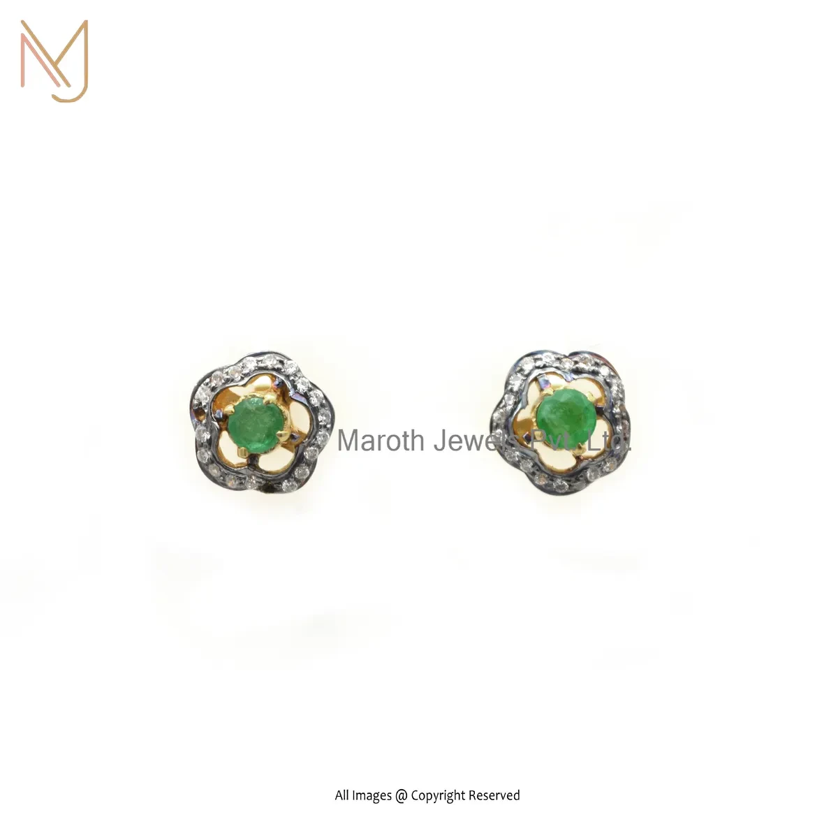 14K Solid Yellow Gold Pave Diamond Emerald Gemstone Stud Earring Custom Jewelry