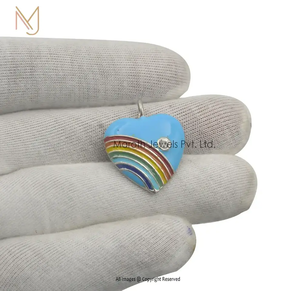 14K White Gold Multi Enamel & White Topaz Heart Pendant Jewelry USA