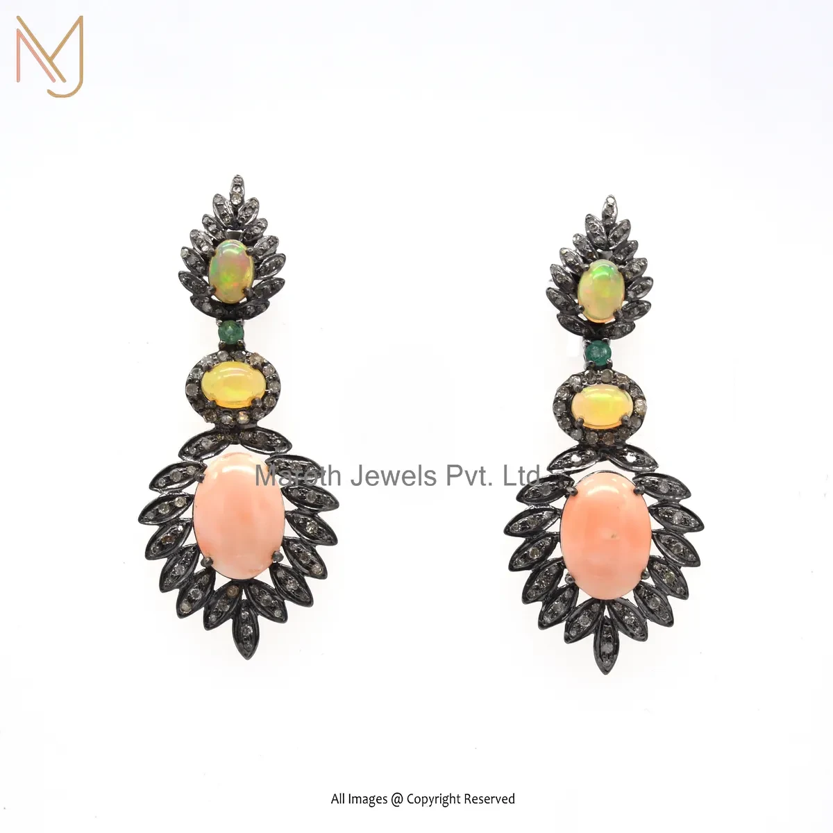 14K White Gold Pave Diamond , Emerald , Opal Gemstone Dangle Earring Custom Jewelry