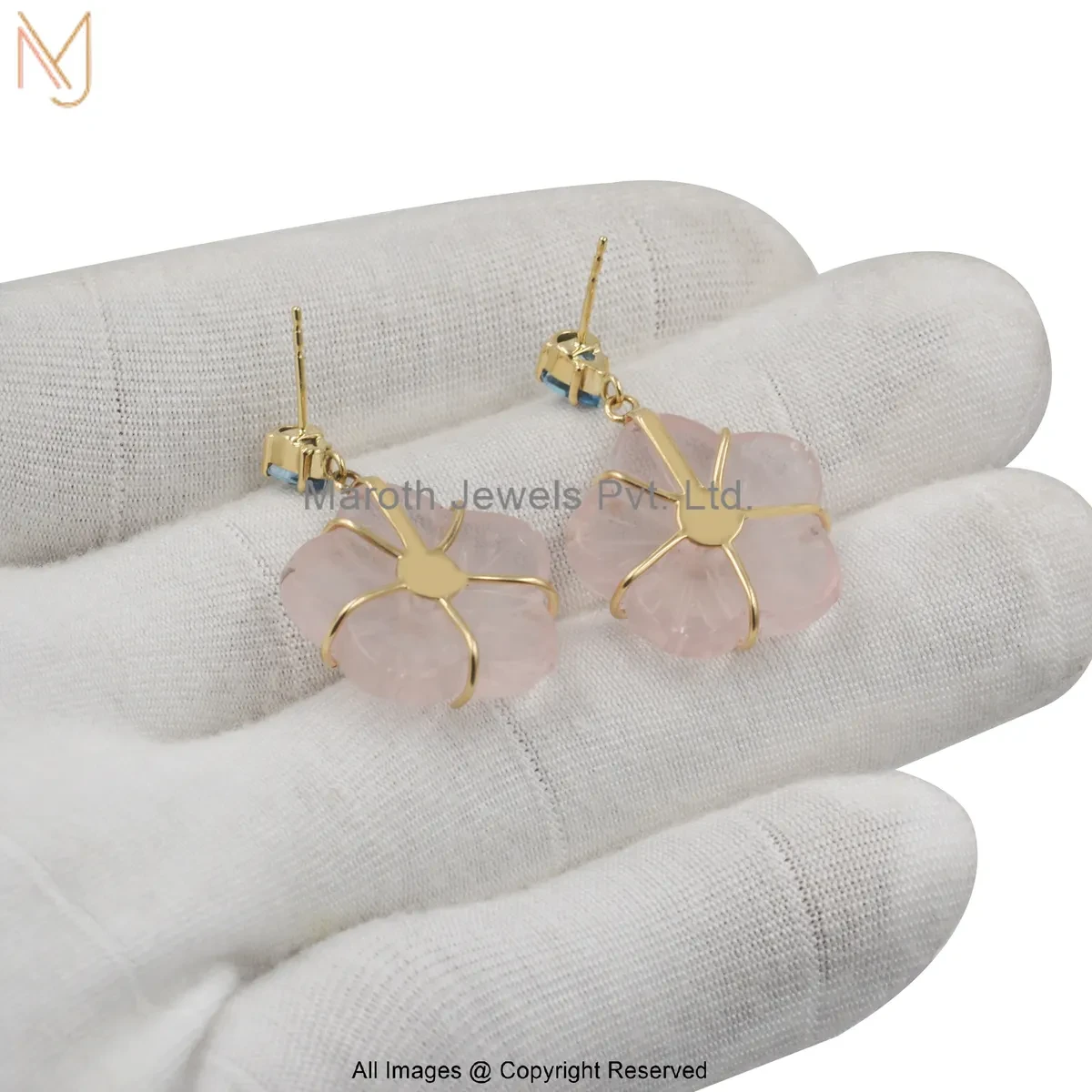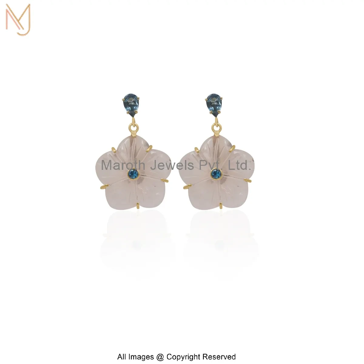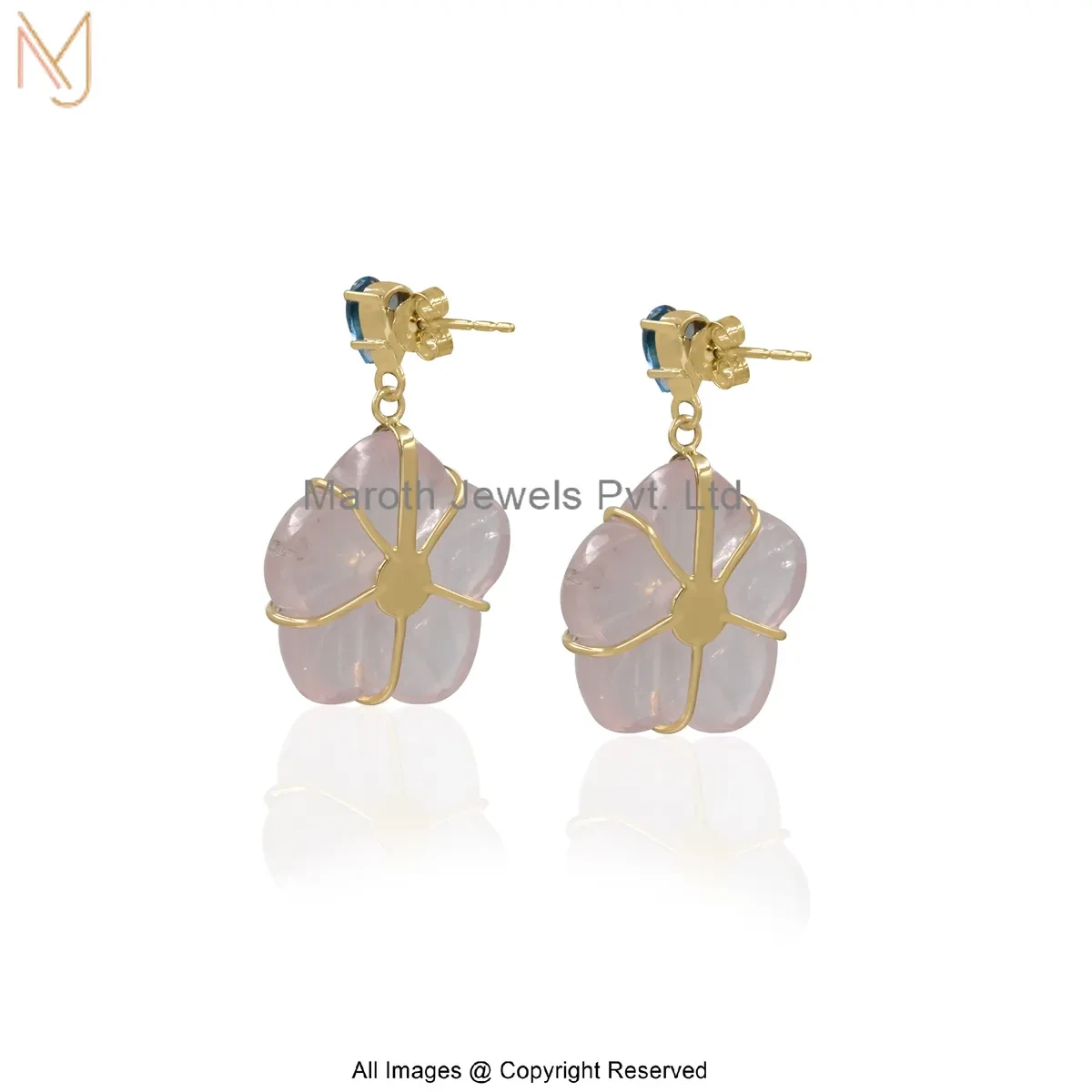 14K Yellow Gold Blue Topaz And Rose Quartz Flower Drop Earring Custom Jewelry