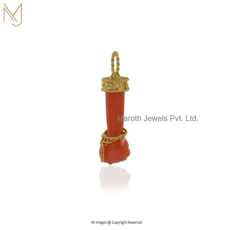 14K Yellow Gold Coral Gemstone Figa Hand Pendant Jewelry Supplier