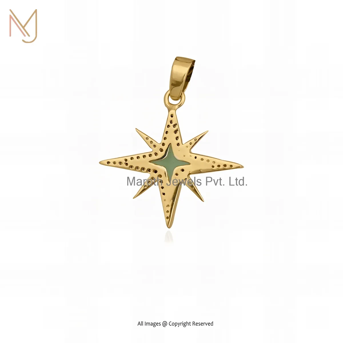 14K Yellow Gold Cubic Zircon & Green Opal Gemstone Star Pendant USA
