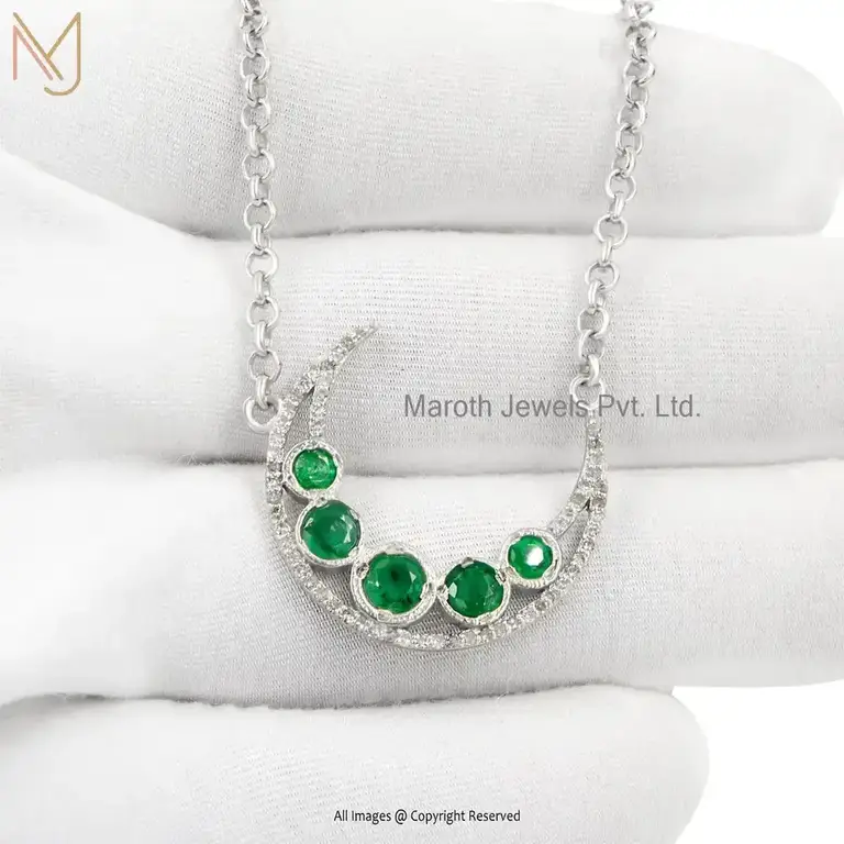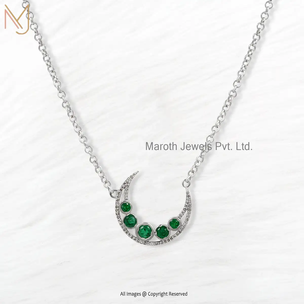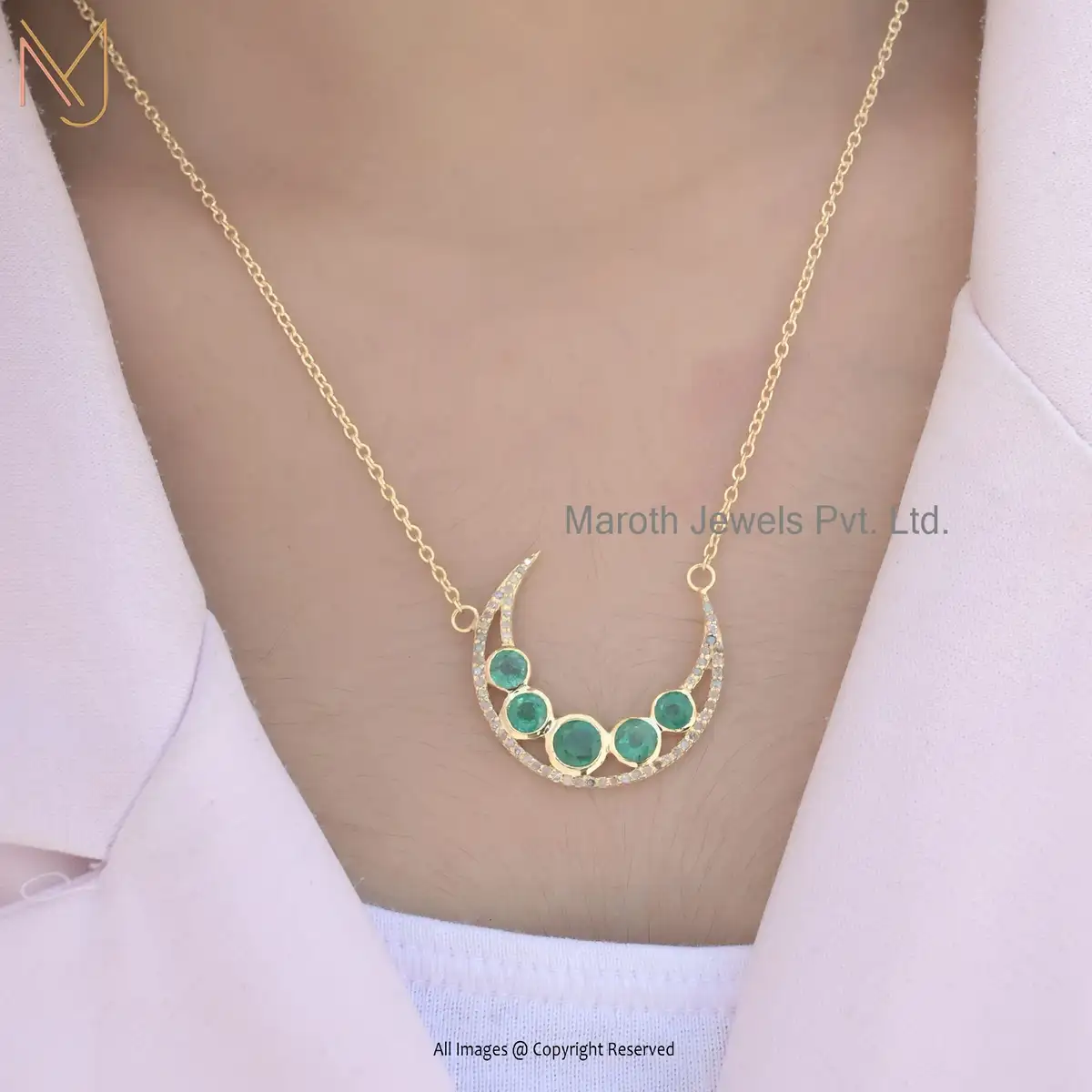 14K Yellow Gold Diamond And Emerald Gemstone Moon Pendant Necklace Custom Jewelry