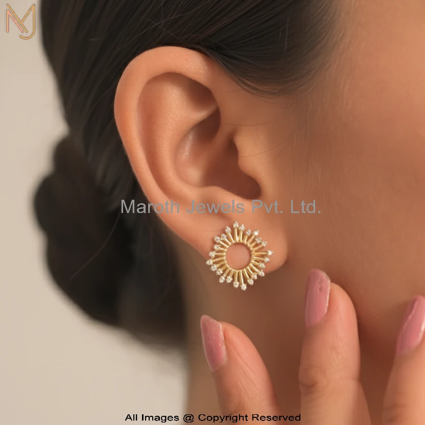 14K Yellow Gold Diamond Cubic Zircon Sunburst Stud Earring Jewelry Supplier