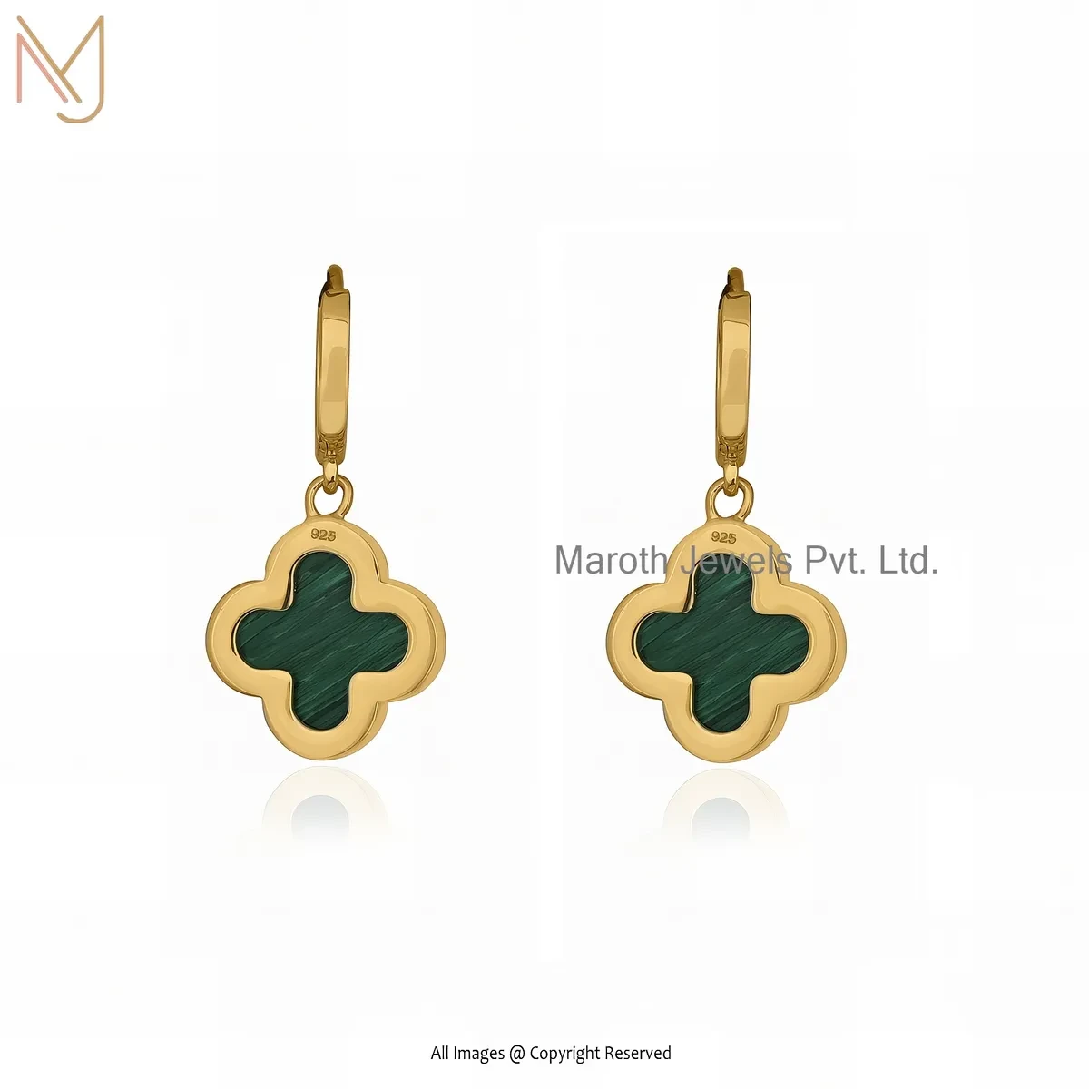 14K Yellow Gold Malachite And Cubic Zircon Four Leaf Clover Earrings USA