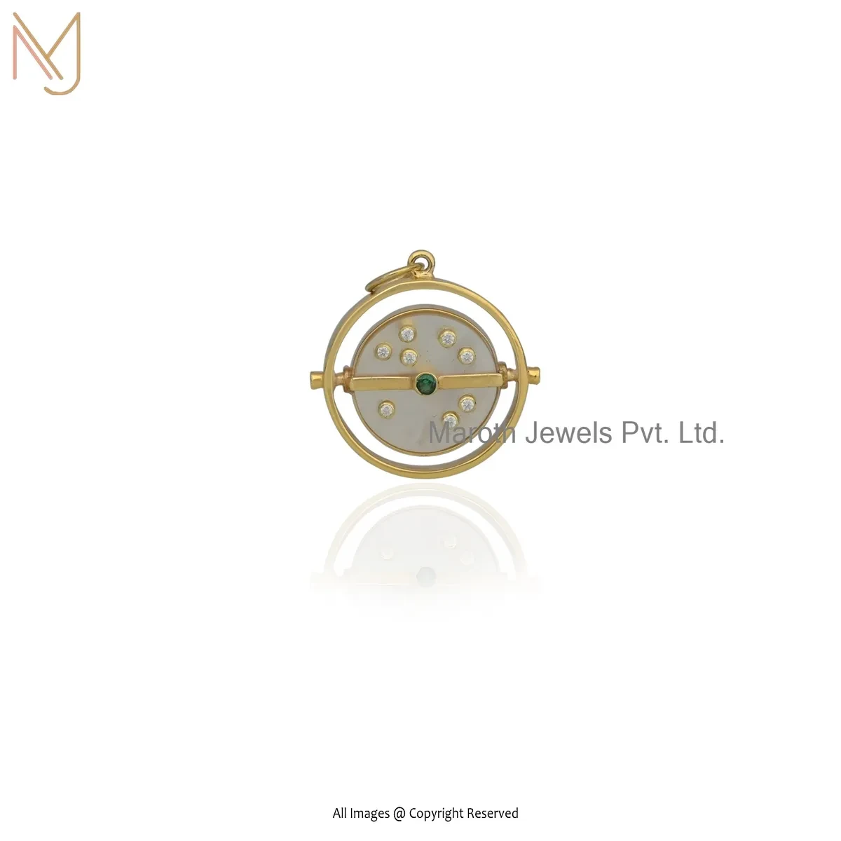 14K Yellow Gold Moissanite And Emerald Gemstone Compass Disc Medallion Charm Pendant USA