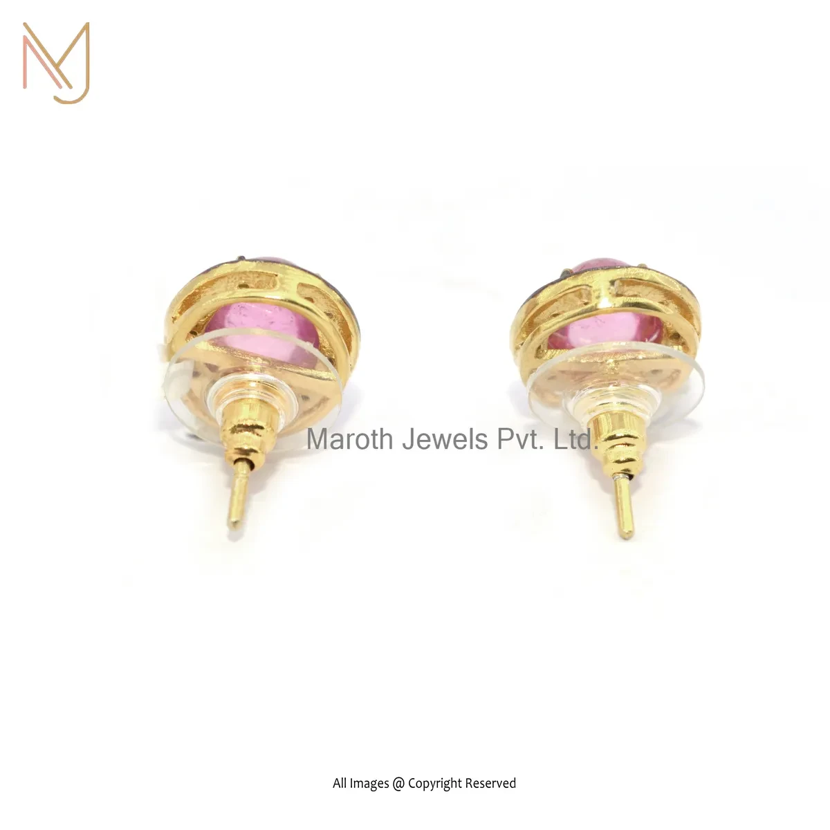 14K Yellow Gold Pave Diamond Pink Sapphire Gemstone Stud Earring Manufacturer
