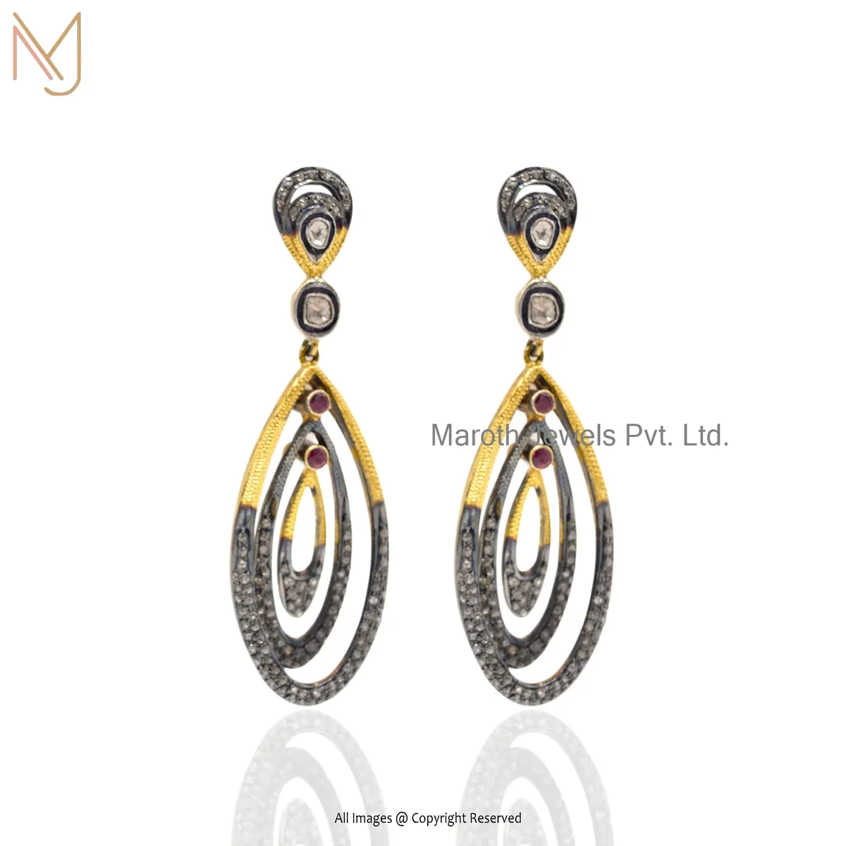 14K Yellow Gold Pave Diamond , Rose Cut Polki Diamond , Ruby Gemstone Drop Dangle Earring USA