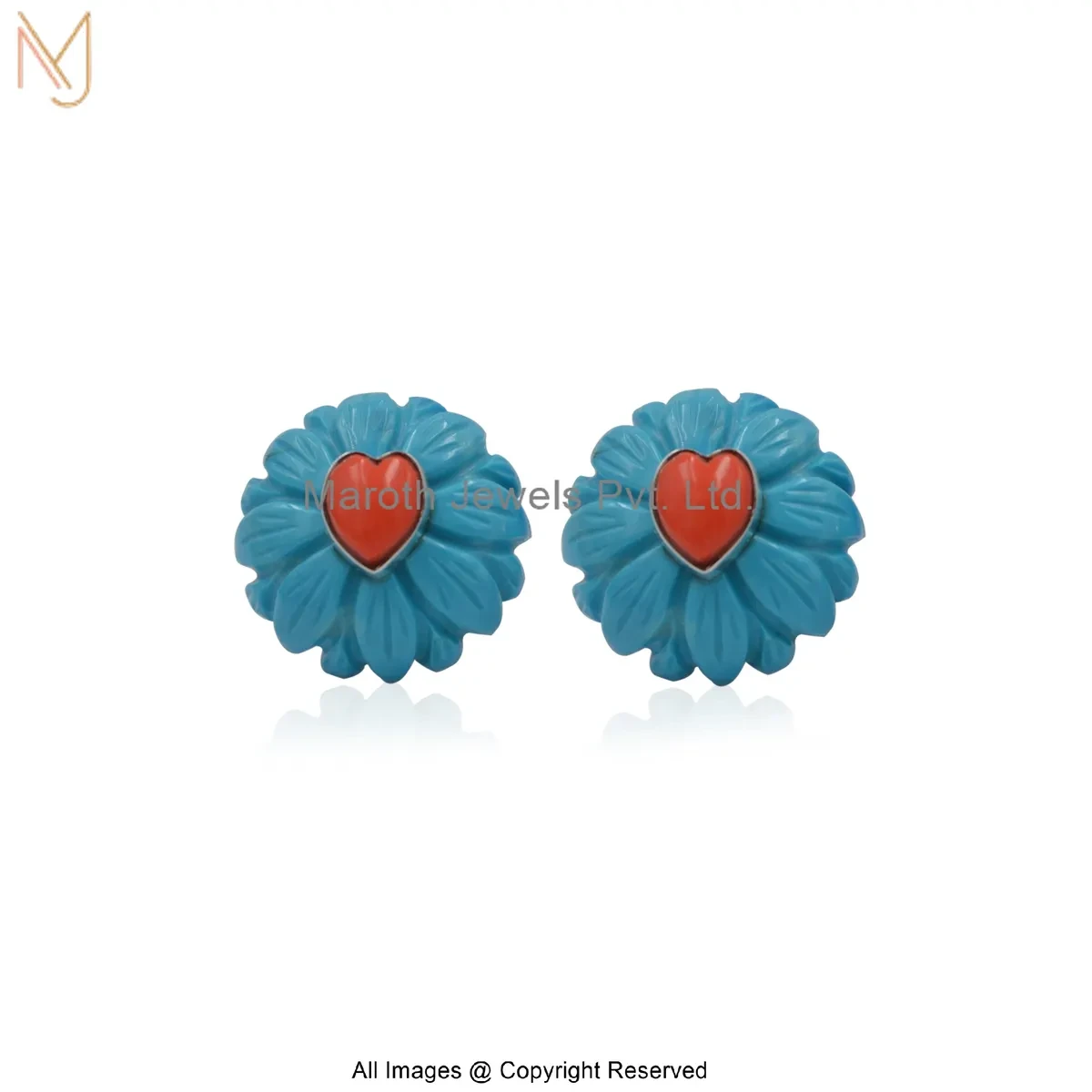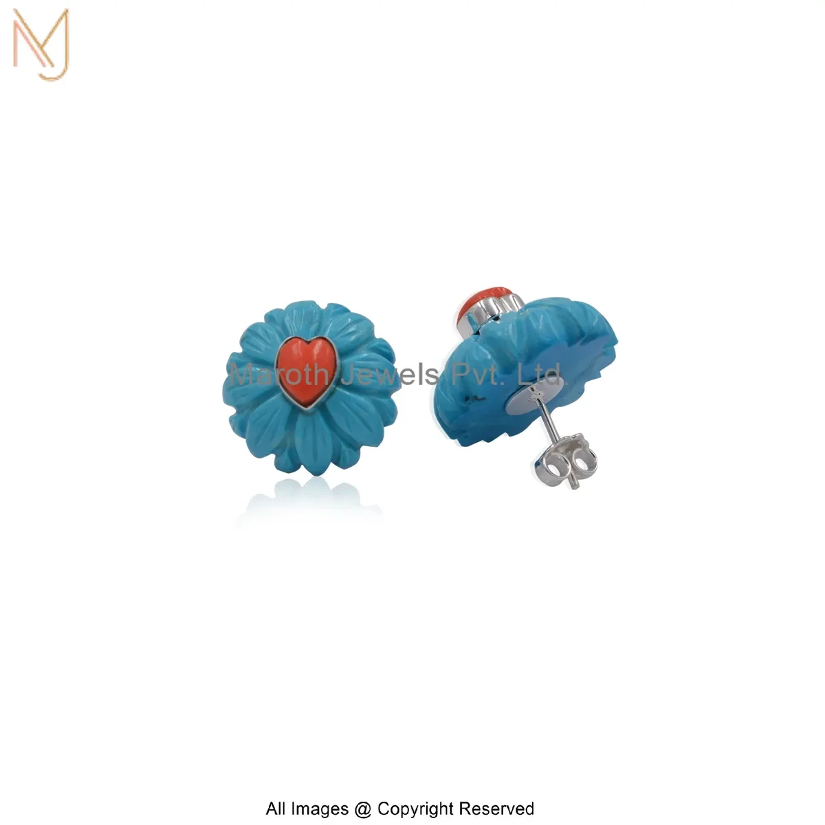 14K Yellow Gold Red Coral And Turquoise Flower Stud Earring Custom Jewelry