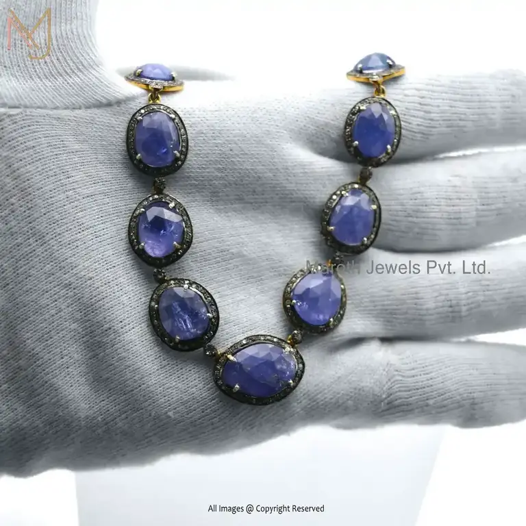 925 Silver Black Rhodium Plated Pave Diamond And Tanzanite Gemstone Link Necklace Silver Jewelry Manufacturer