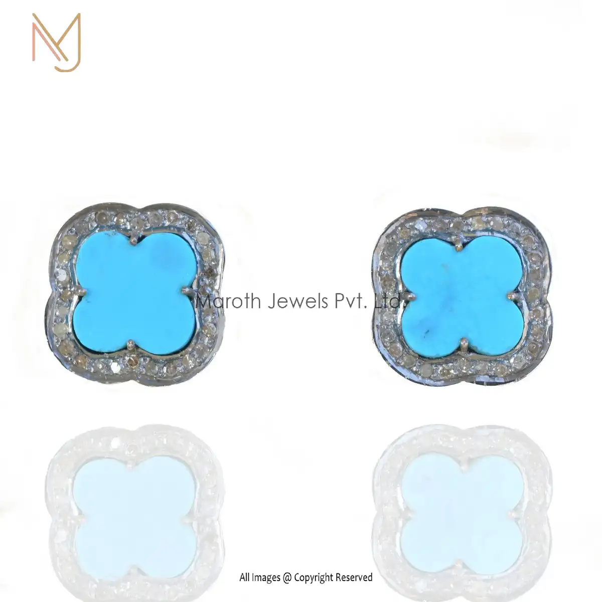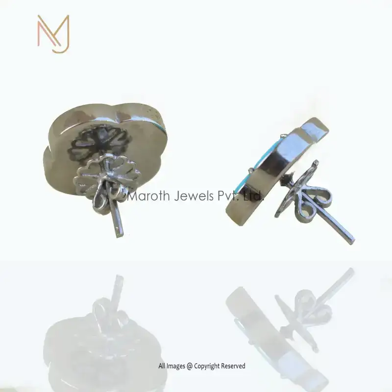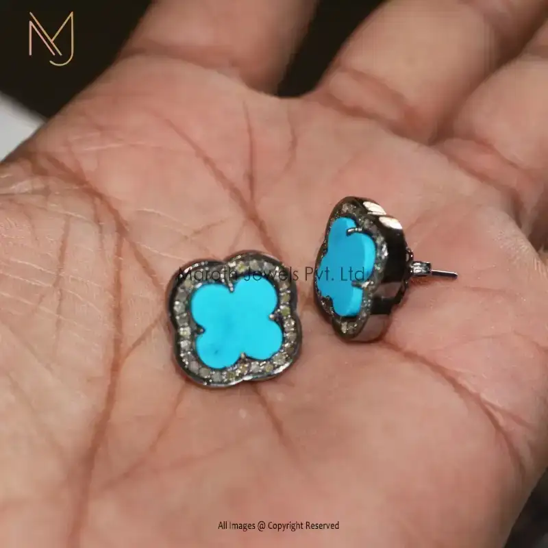 925 Silver Pave Diamond And Turquoise Gemstone Clover Tiny Studs Manufacturer