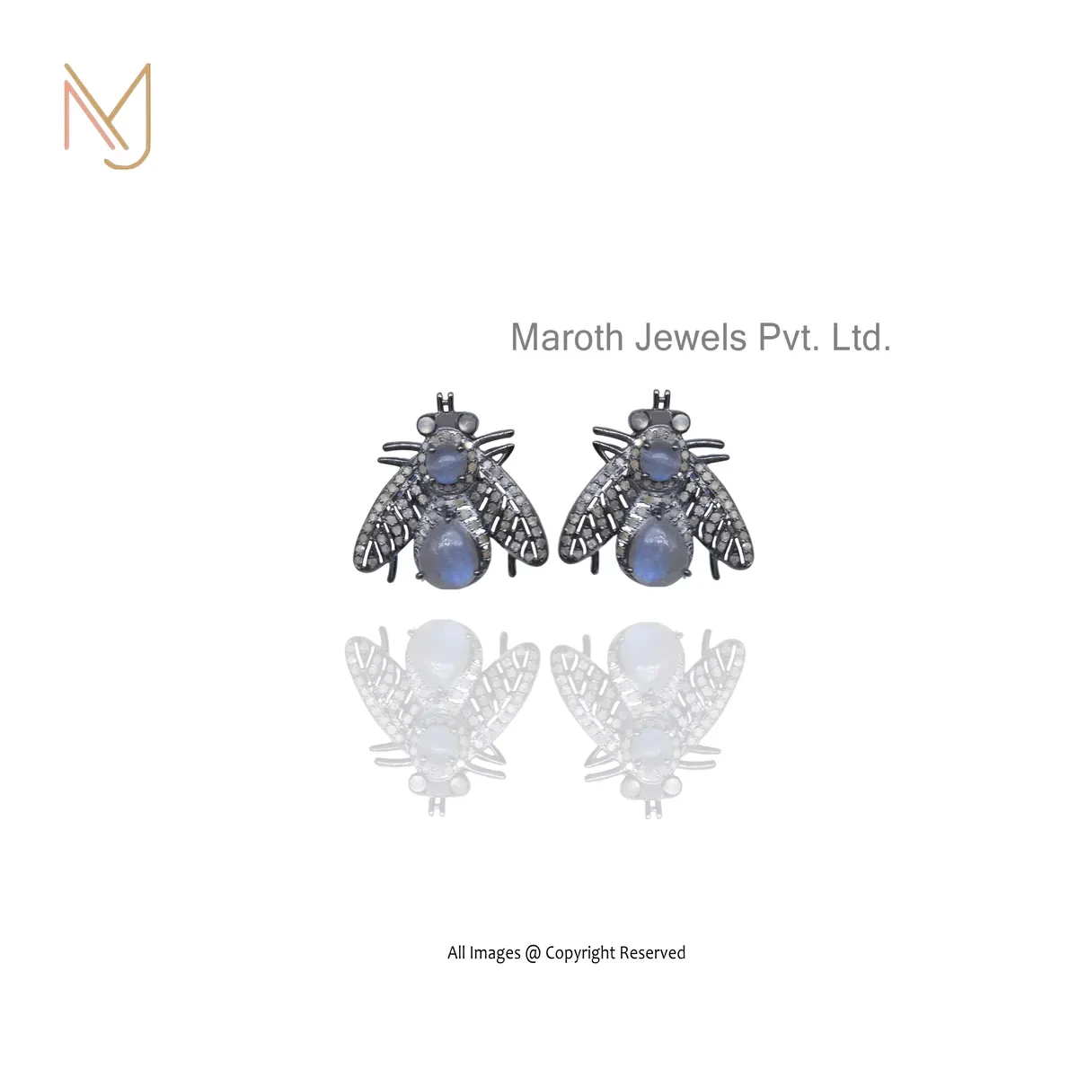 925 Silver Rhodium Plated Diamond Labradorite Bee Honey Stud Earring Custom Jewelry