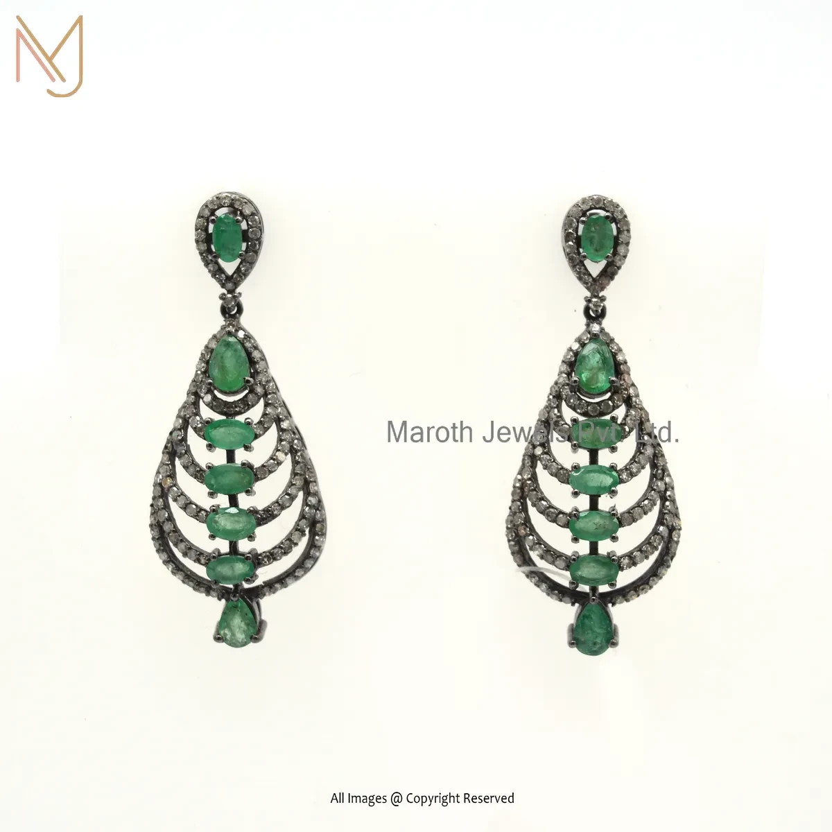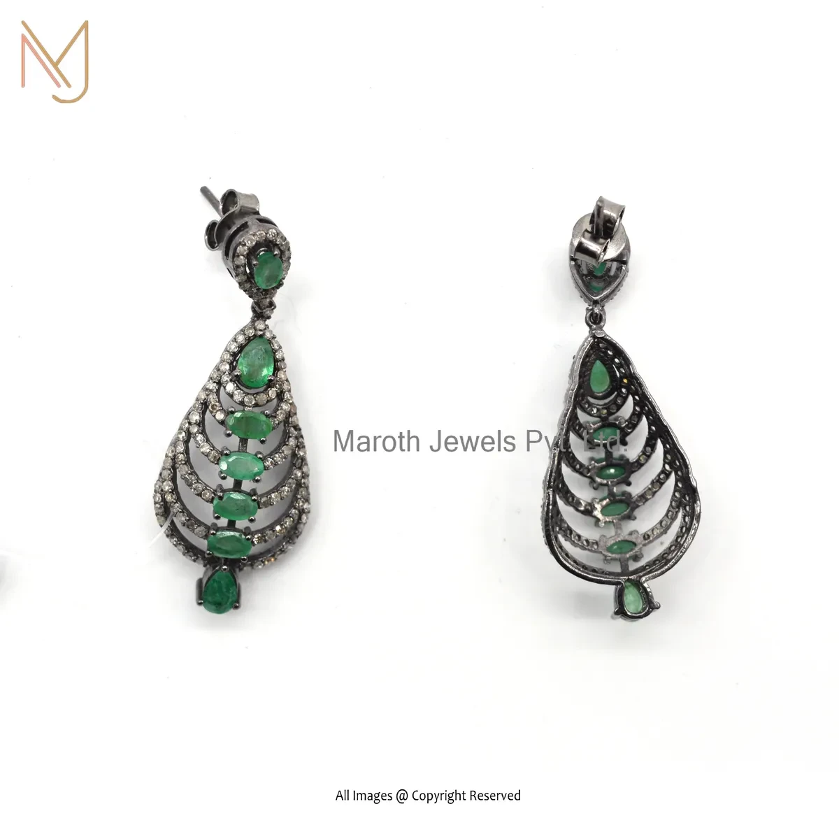 925 Silver Rhodium Plated Pave Diamond Emerald Gemstone Drop Earring Custom Jewelry