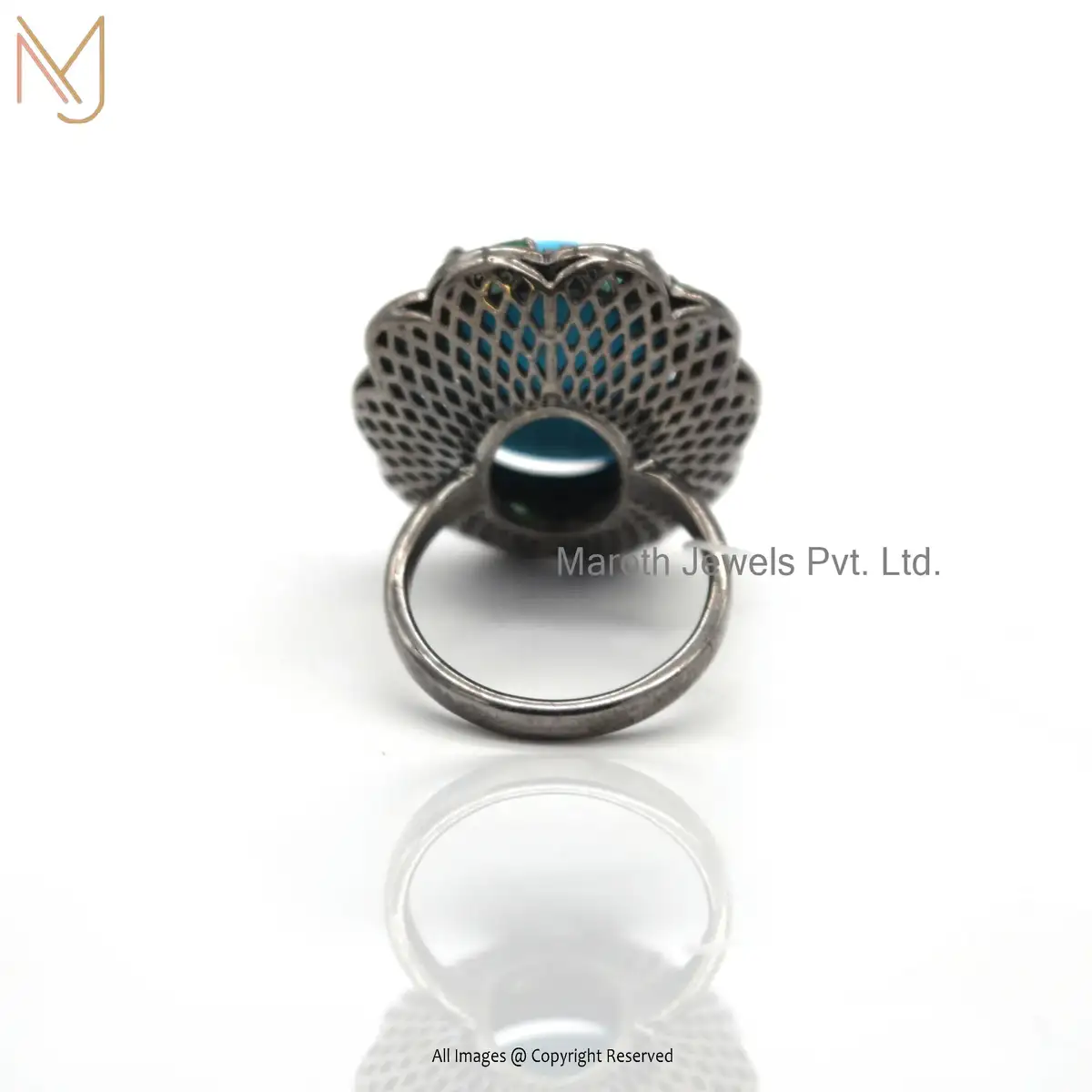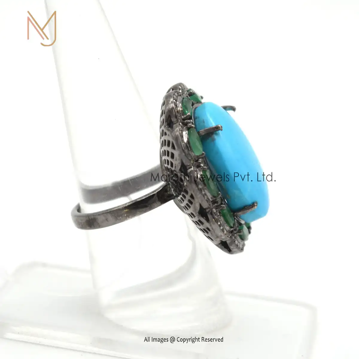 925 Silver Rhodium Plated Pave Diamond Emerald & Turquoise Gemstone Designer Ring Manufacturer