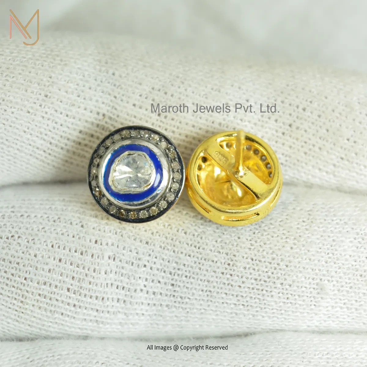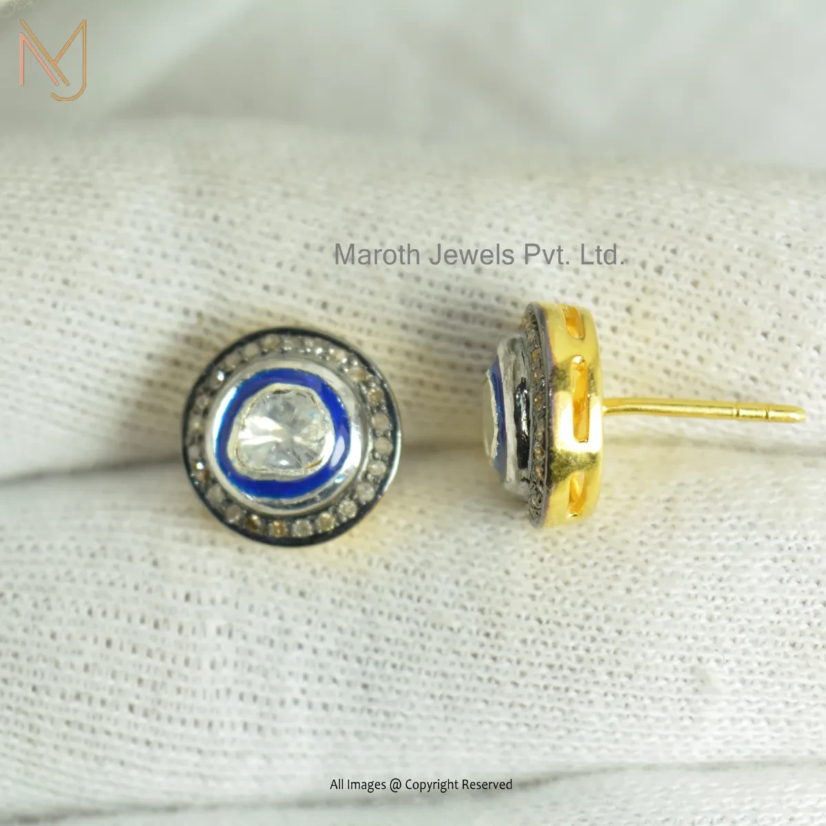 925 Silver Rhodium Yellow Gold Plated Pave Diamond And Blue Enamel Rose Cut Polki Diamond Stud Earring USA