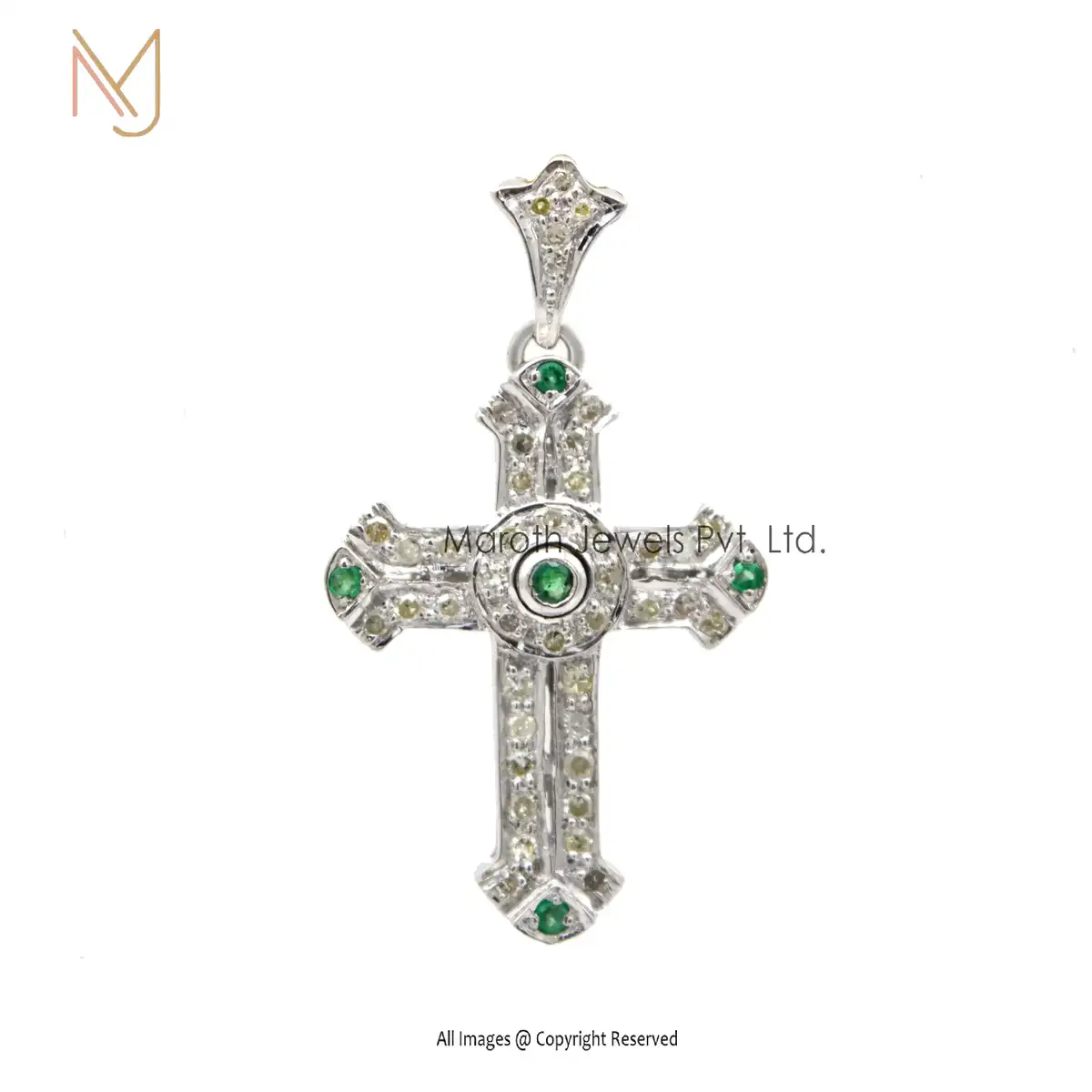 925 Silver White Gold Plated Pave Diamond And Emerald Cross Pendant Jewelry
