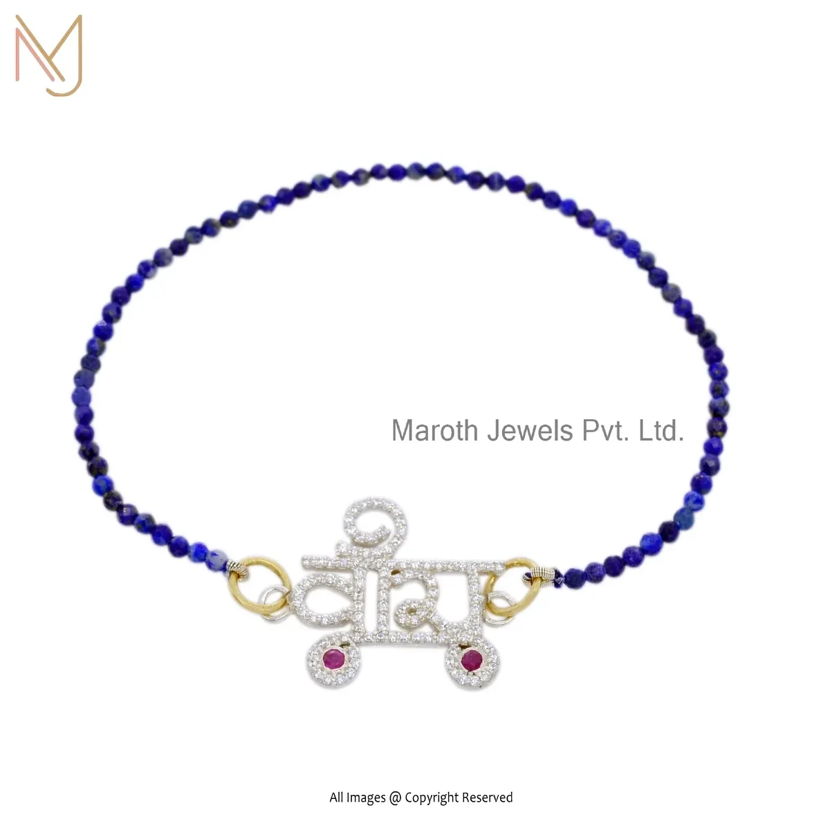 925 Silver White Gold Plated Diamond & Pink Sapphire Lapis Lazuli Beads Veera Letter Bracelet USA