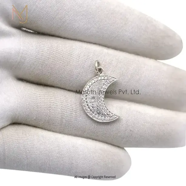 925 Silver White Gold Plated Pave Diamond Crescent Moon Pendant Custom Jewelry
