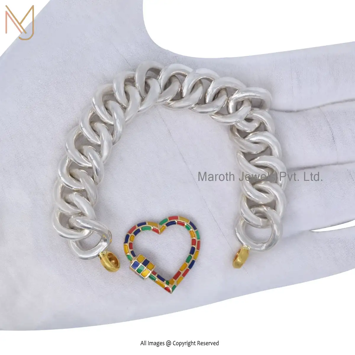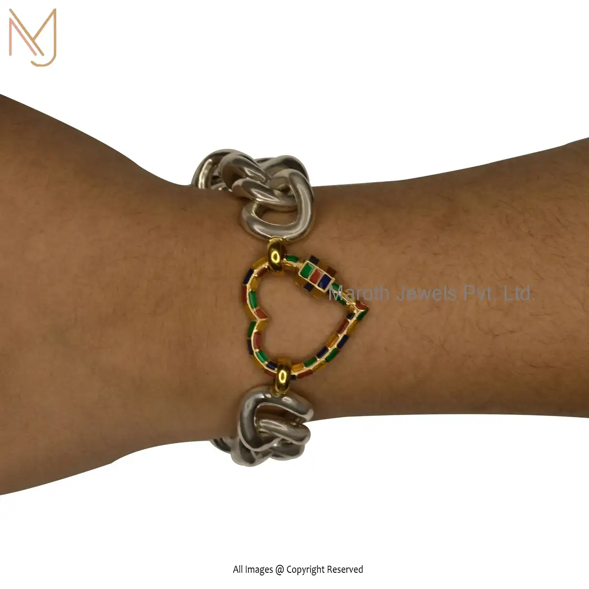 925 Silver White Gold & Yellow Gold Plated Multi Enamel Heart Carabiner Lock Chain Bracelet USA