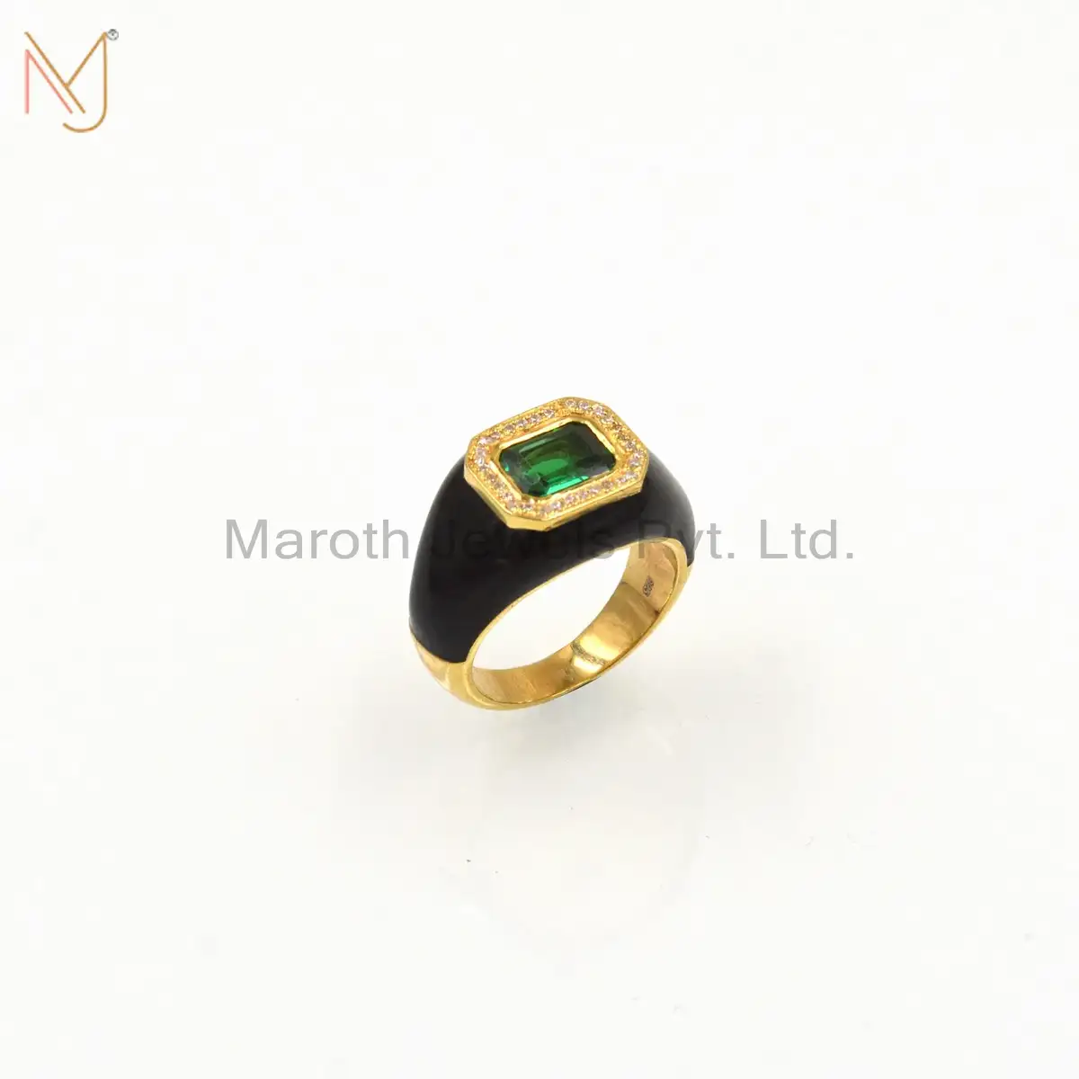 925 Silver Yellow Gold Baguette CZ Ring Black Enamel Band Ring Manufacturer