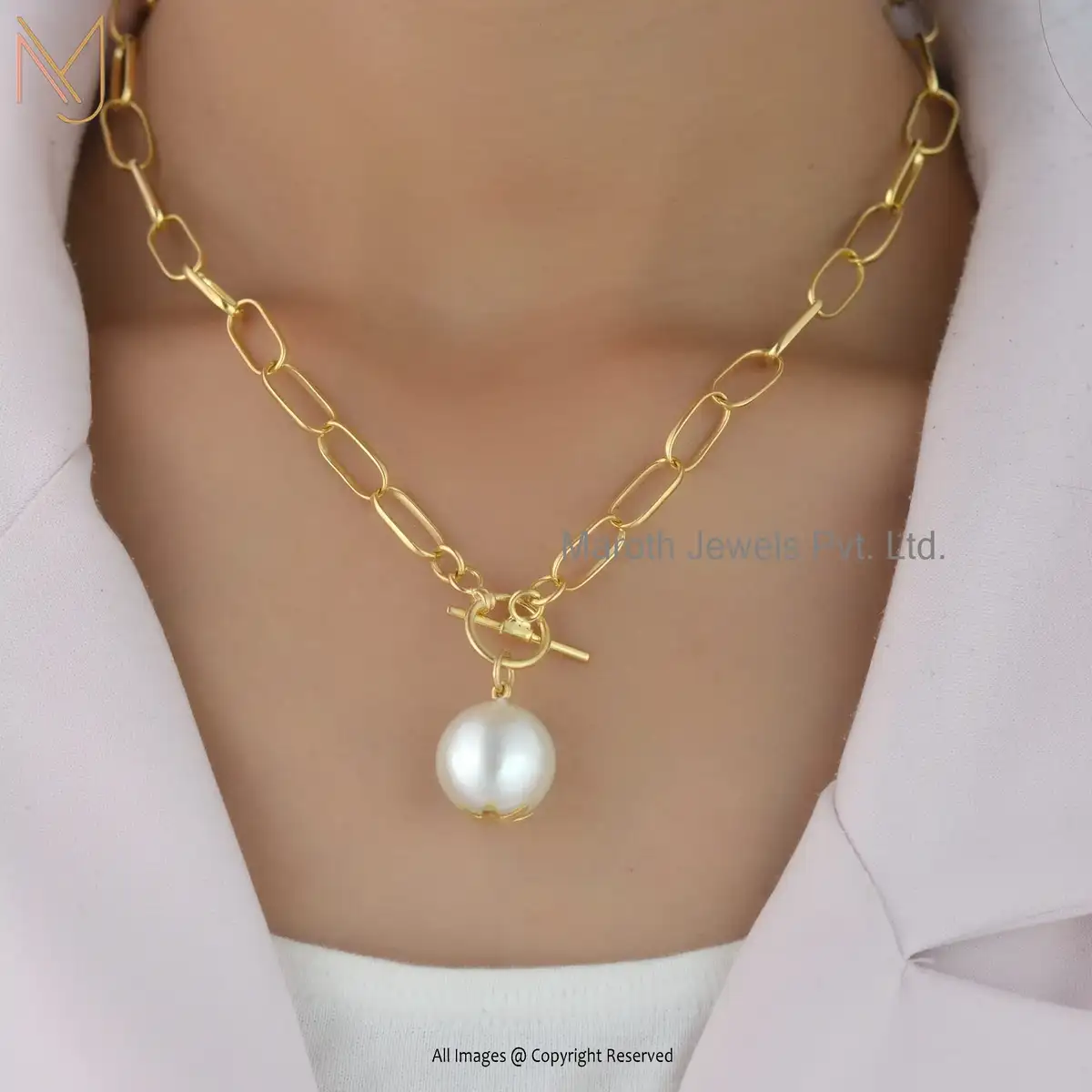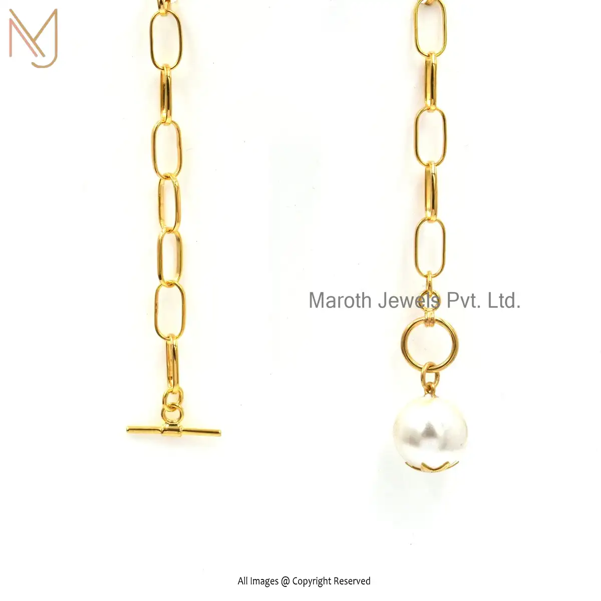 925 Silver Yellow Gold Oval Link Togal Claps Pearl Charm Necklace Jewelry Supplier