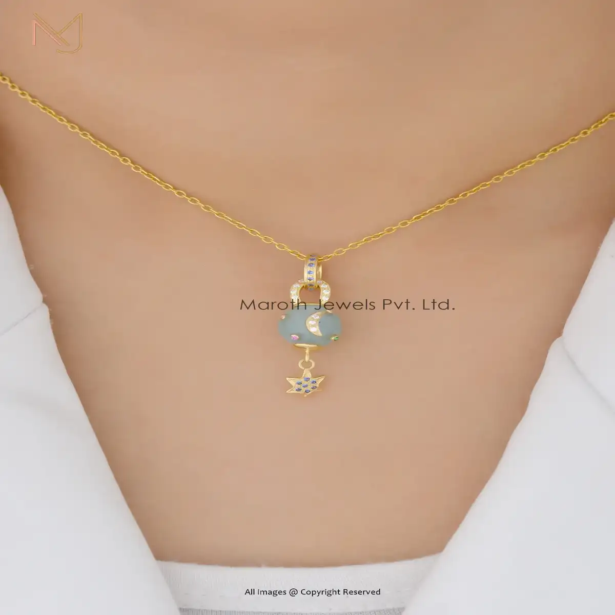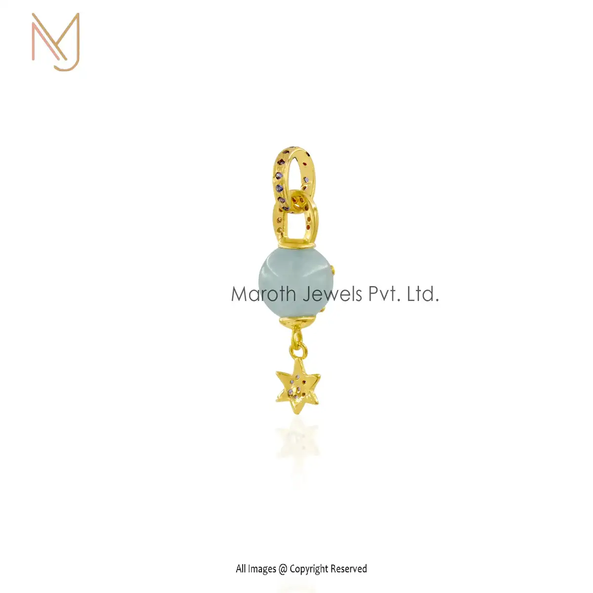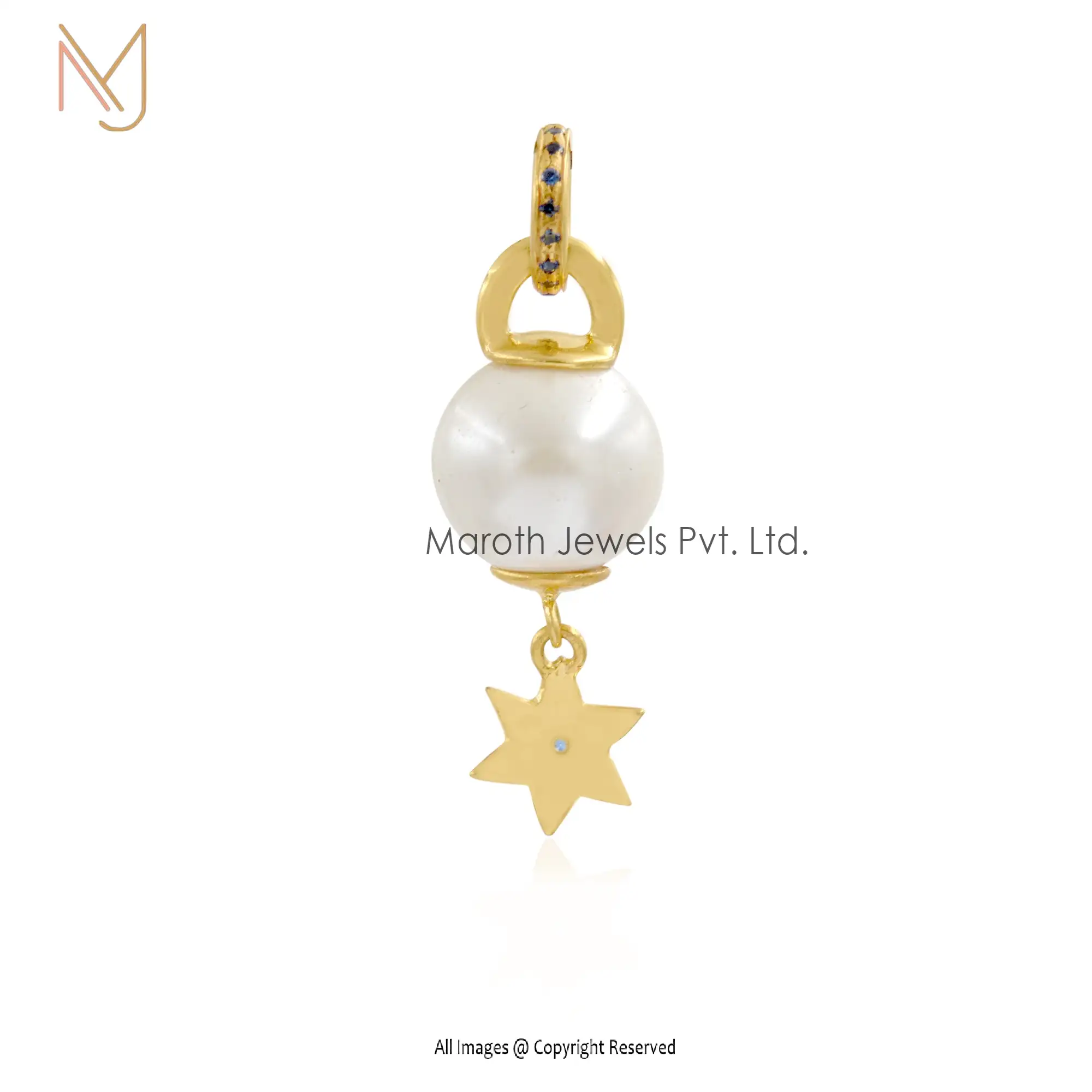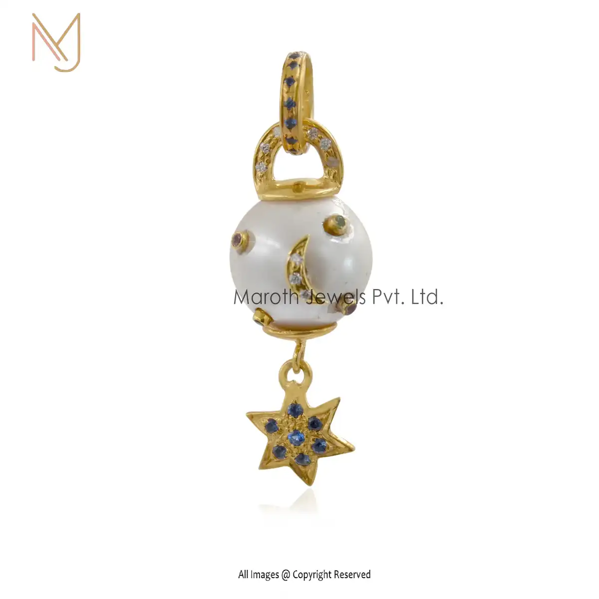 925 Silver Yellow Gold Pearl & Moissanite And Blue Sapphire Moonstar Ball Pendant Jewelry USA