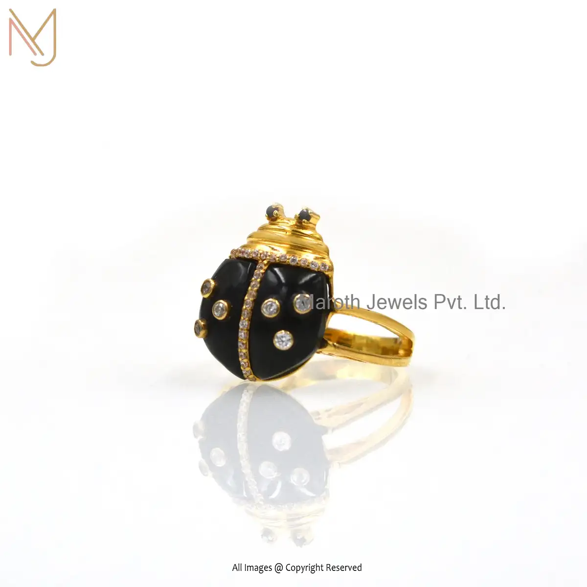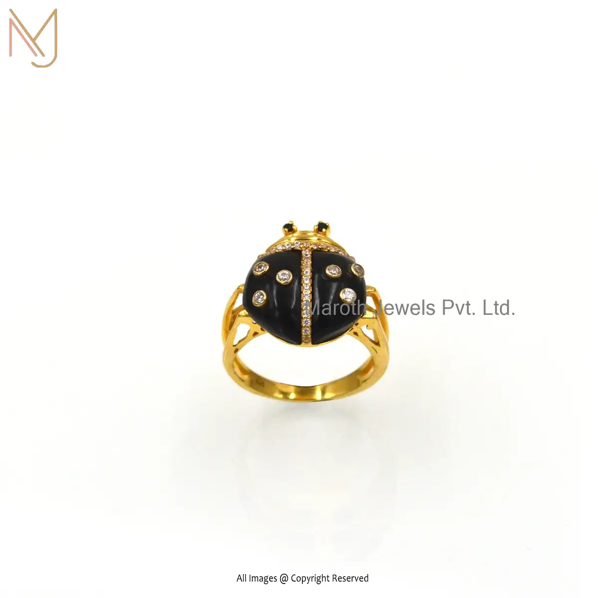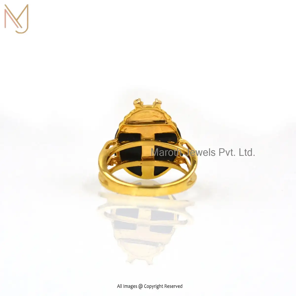 925 Silver Yellow Gold Plated Black Onyx & White CZ Bug Ring Custom Jewelry