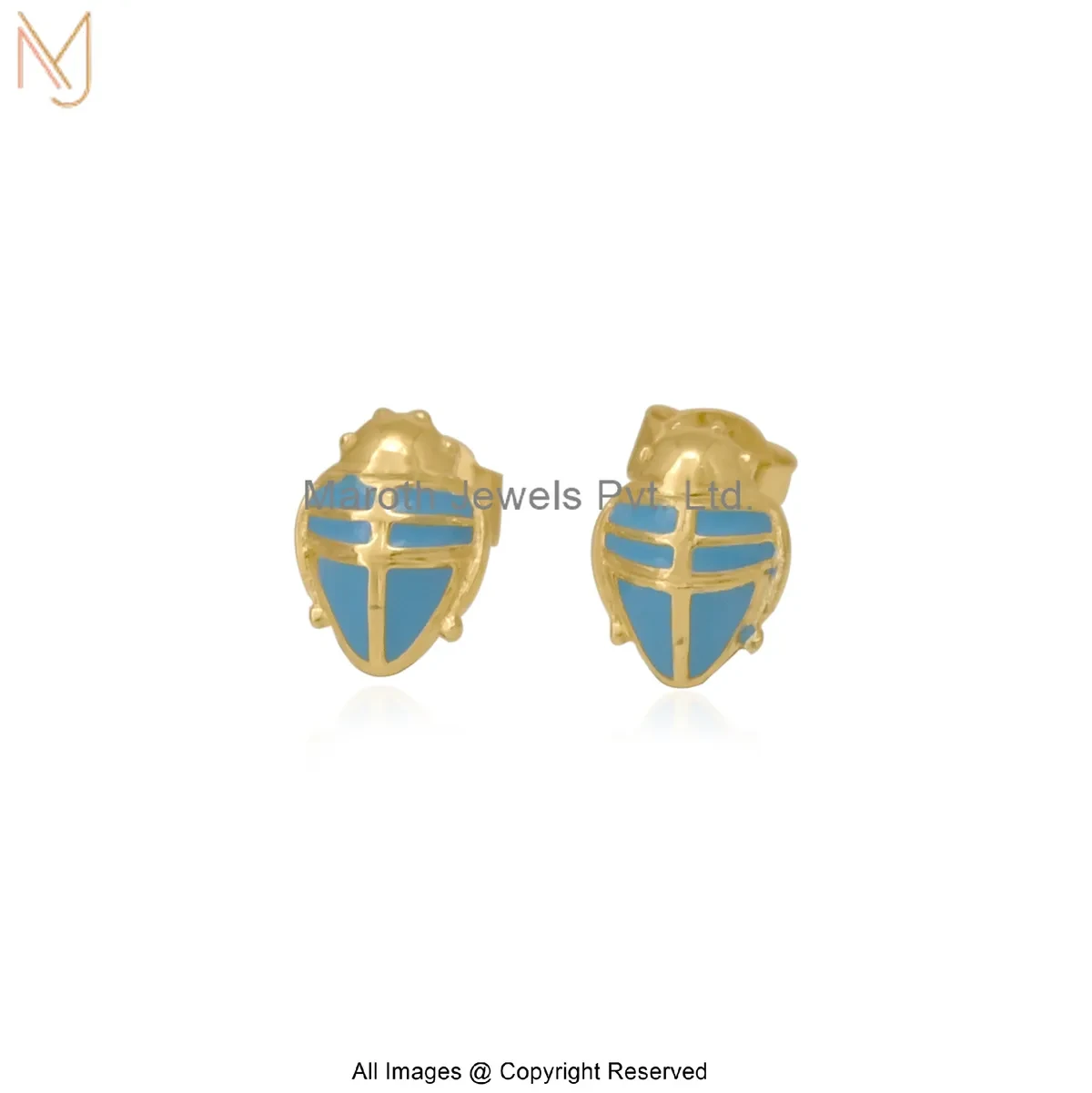 925 Silver Yellow Gold Plated Blue Enamel Scarab Beetle Stud Earring Custom Jewelry