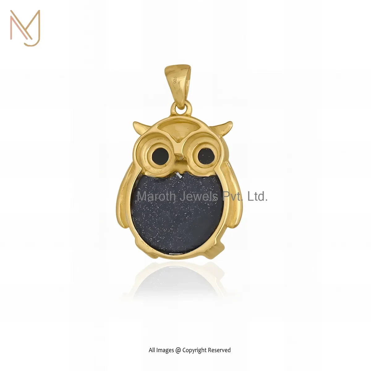 925 Silver Yellow Gold Plated Blue Sunstone Owl Pendant Custom Jewelry
