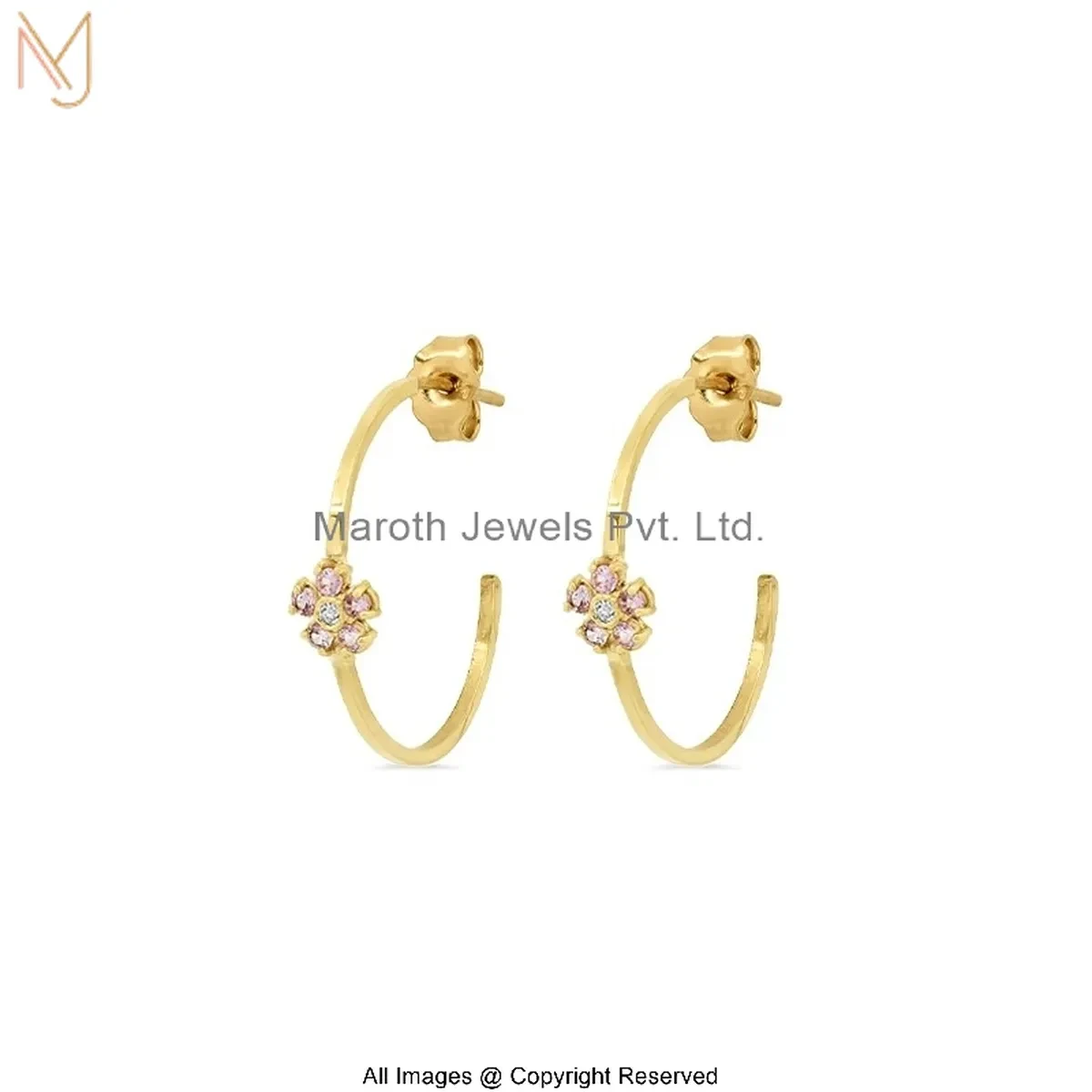 925 Silver Yellow Gold Plated Diamond Gemstone Flower Design Hoop Earring Custom Jewelry