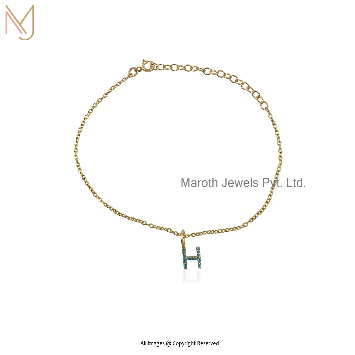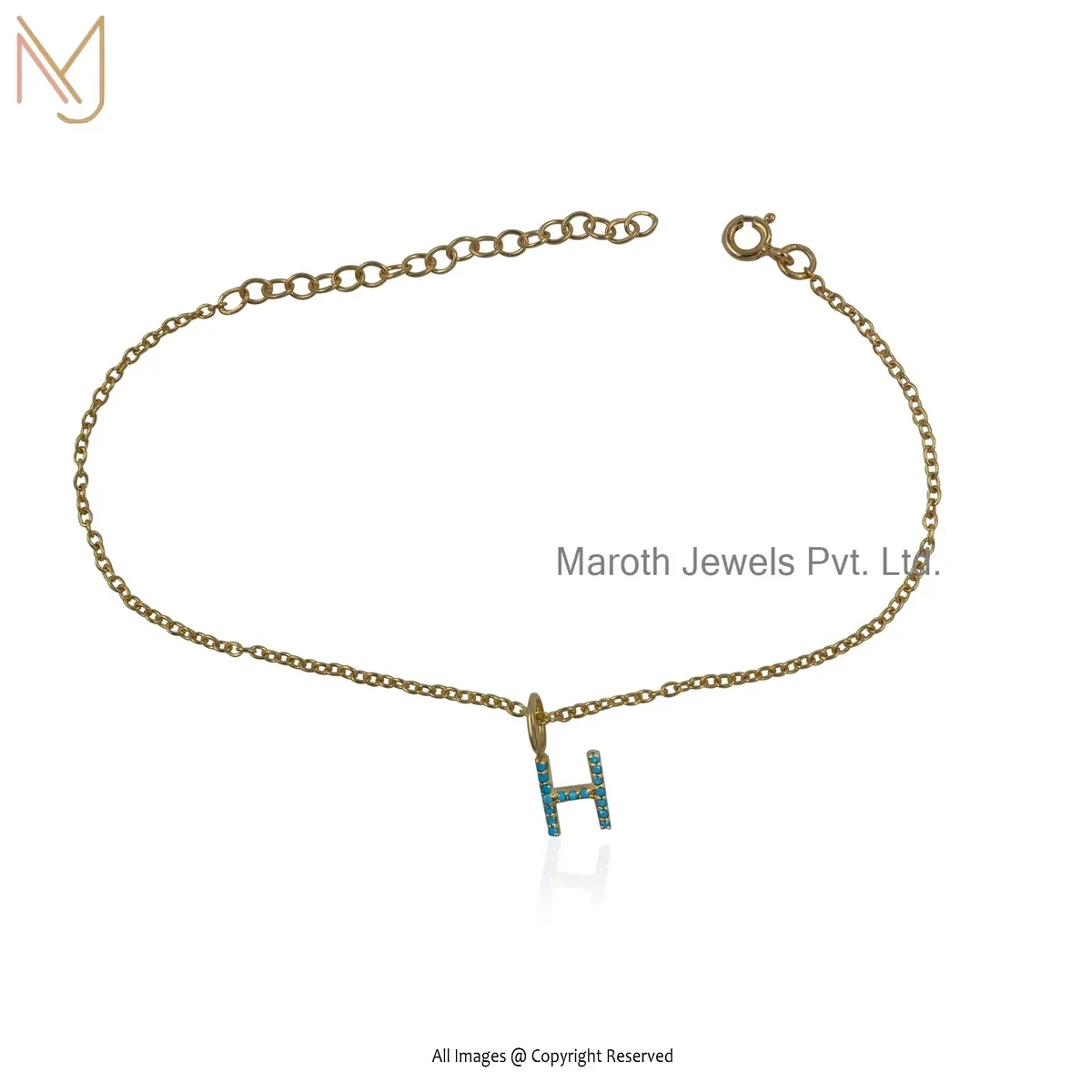 925 Silver Yellow Gold Plated Diamond & Turquoise Initial H Letter Charm Bracelet Custom Jewelry