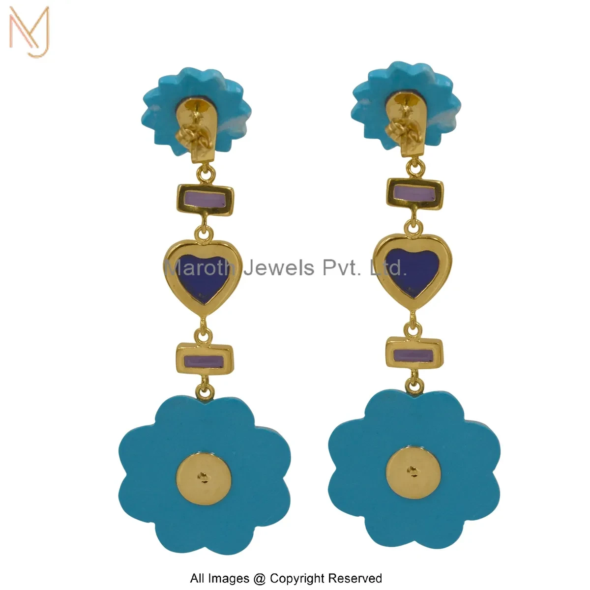 925 Silver Yellow Gold Plated Lapiz Lazuli , Amethyst , White Topaz , Turquoise Carved Flower Dangle Earring USA
