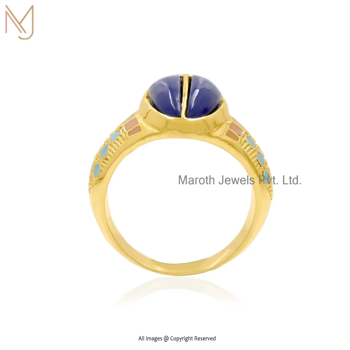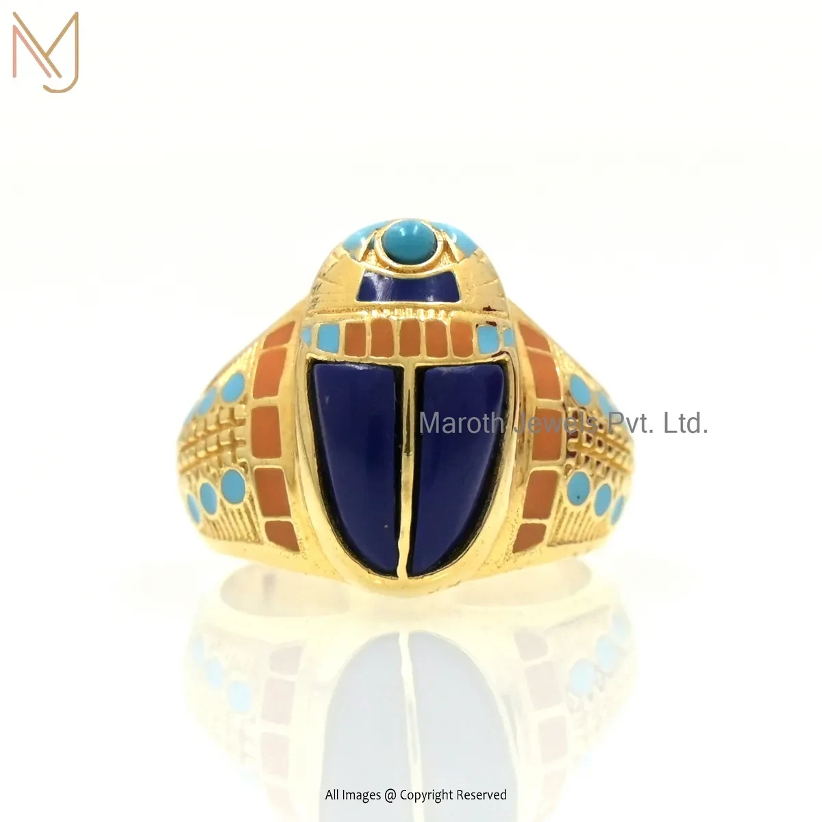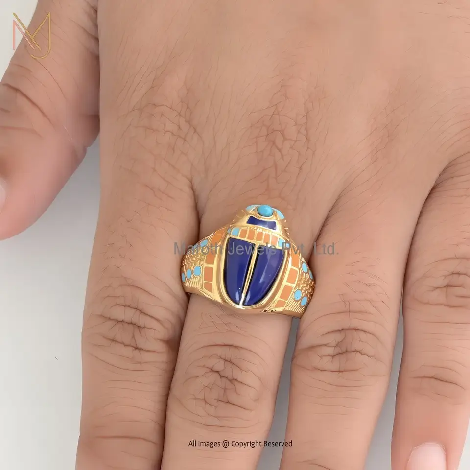 925 Silver Yellow Gold Plated Lapiz Lazuli And Turquoise & Multi Enamel Scarab Ring USA