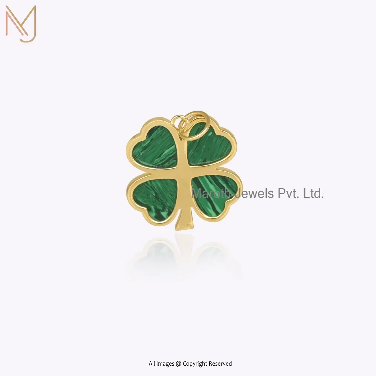 925 Silver Yellow Gold Plated Moissanite & Malachite Gemstone Four Leaf Clover Charm Pendant USA