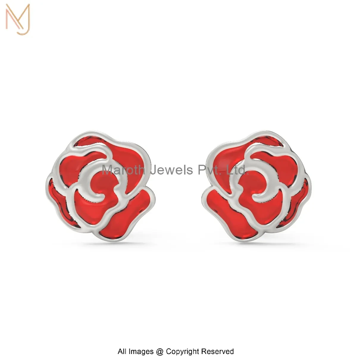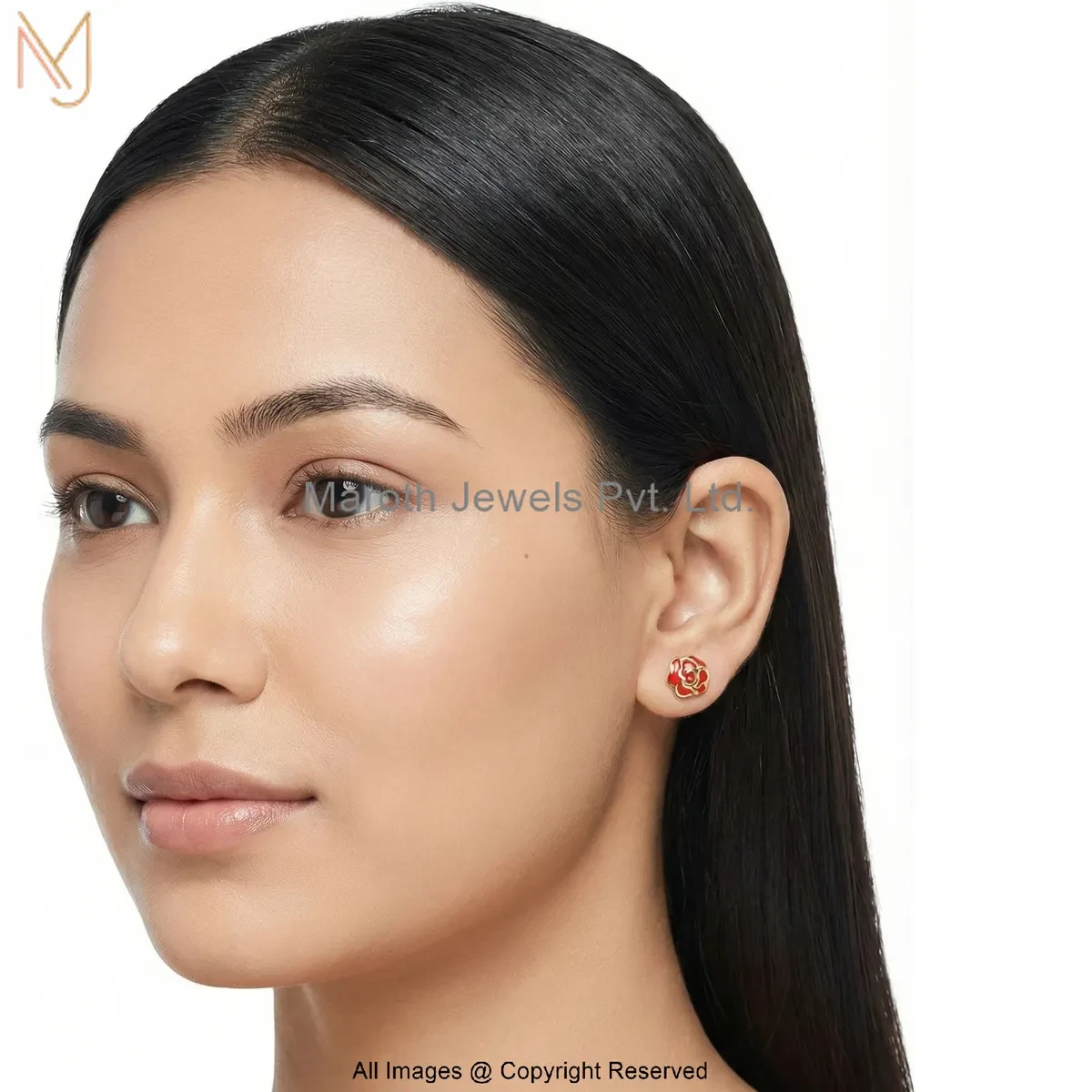925 Silver Yellow Gold Plated Red Enamel Scarlet Rose Stud Earrings Custom Jewelry
