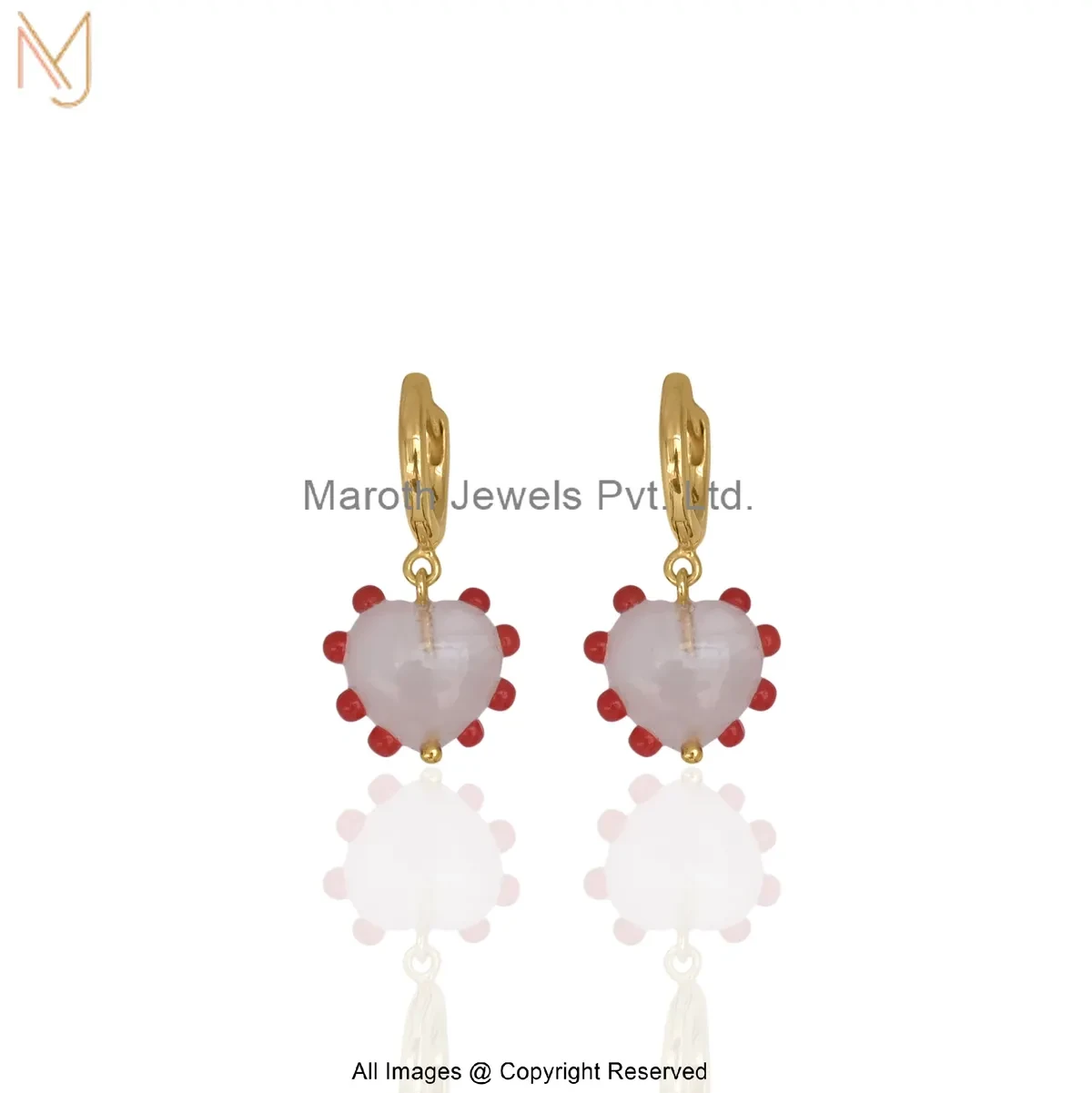 925 Silver Yellow Gold Plated Rose Quartz Heart Drop Earrings Jewelry Supplier