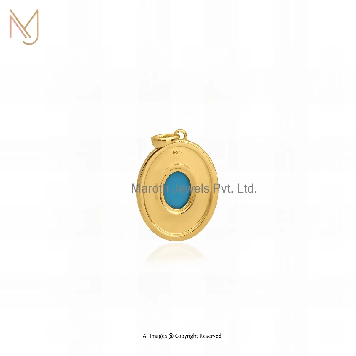 925 Silver Yellow Gold Plated Turquoise & Moissanite Fluted Oval Pendant Custom Jewelry