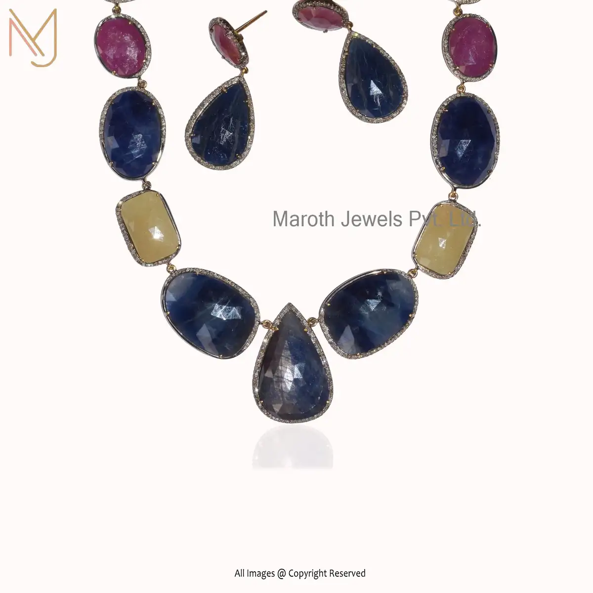 925 Silver Yellow Gold RH Multi Sapphire & Diamond Earrings Necklace Set Jewelry Supplier