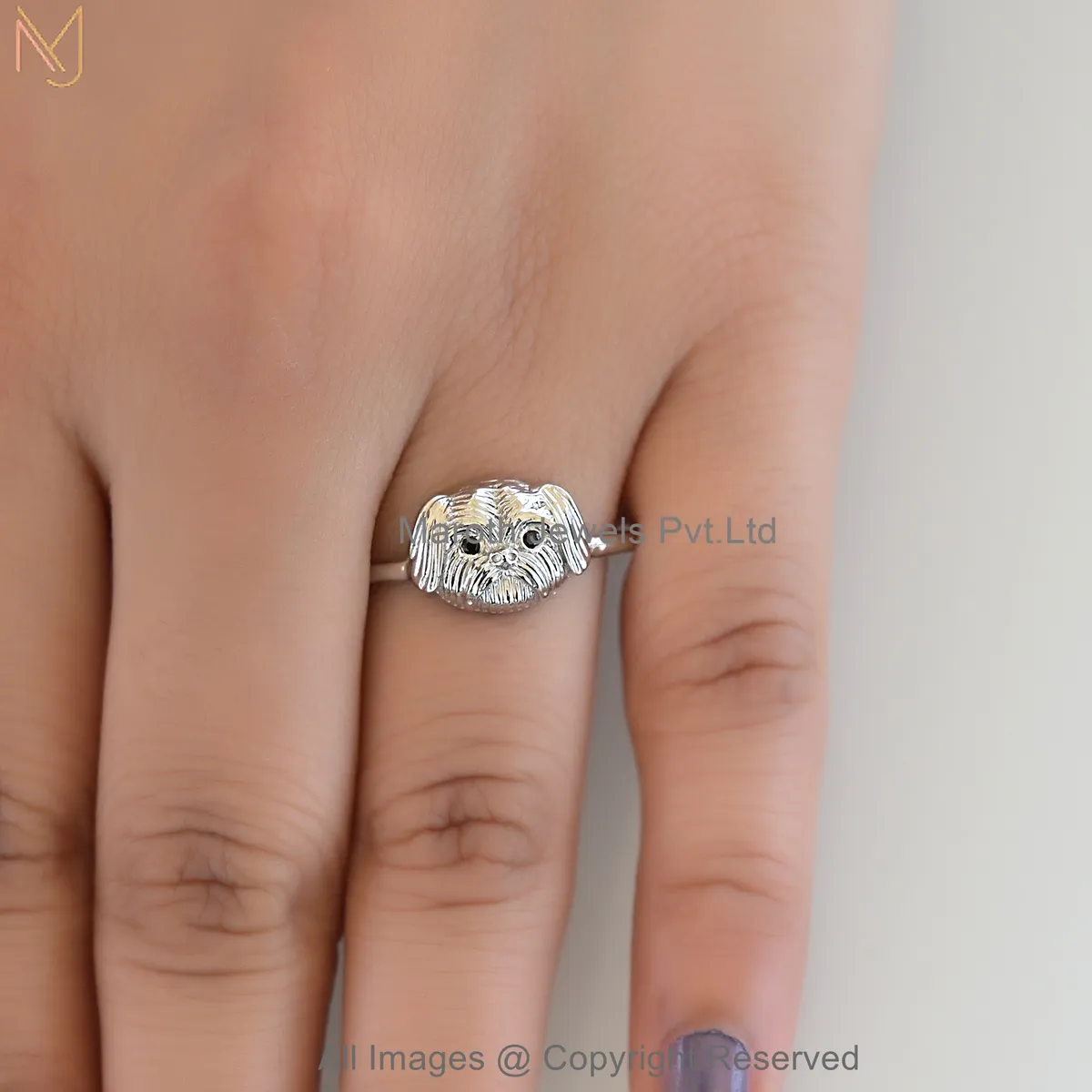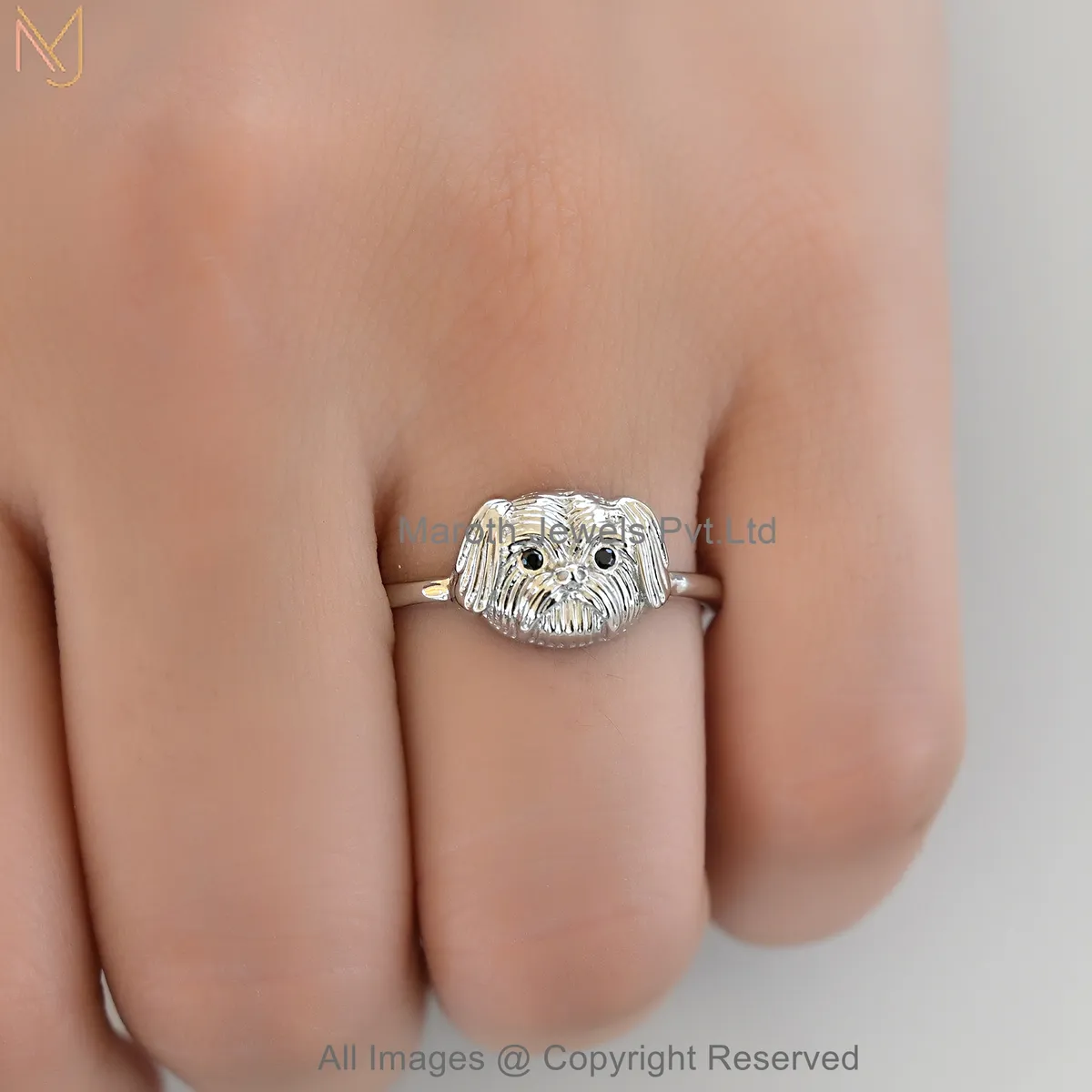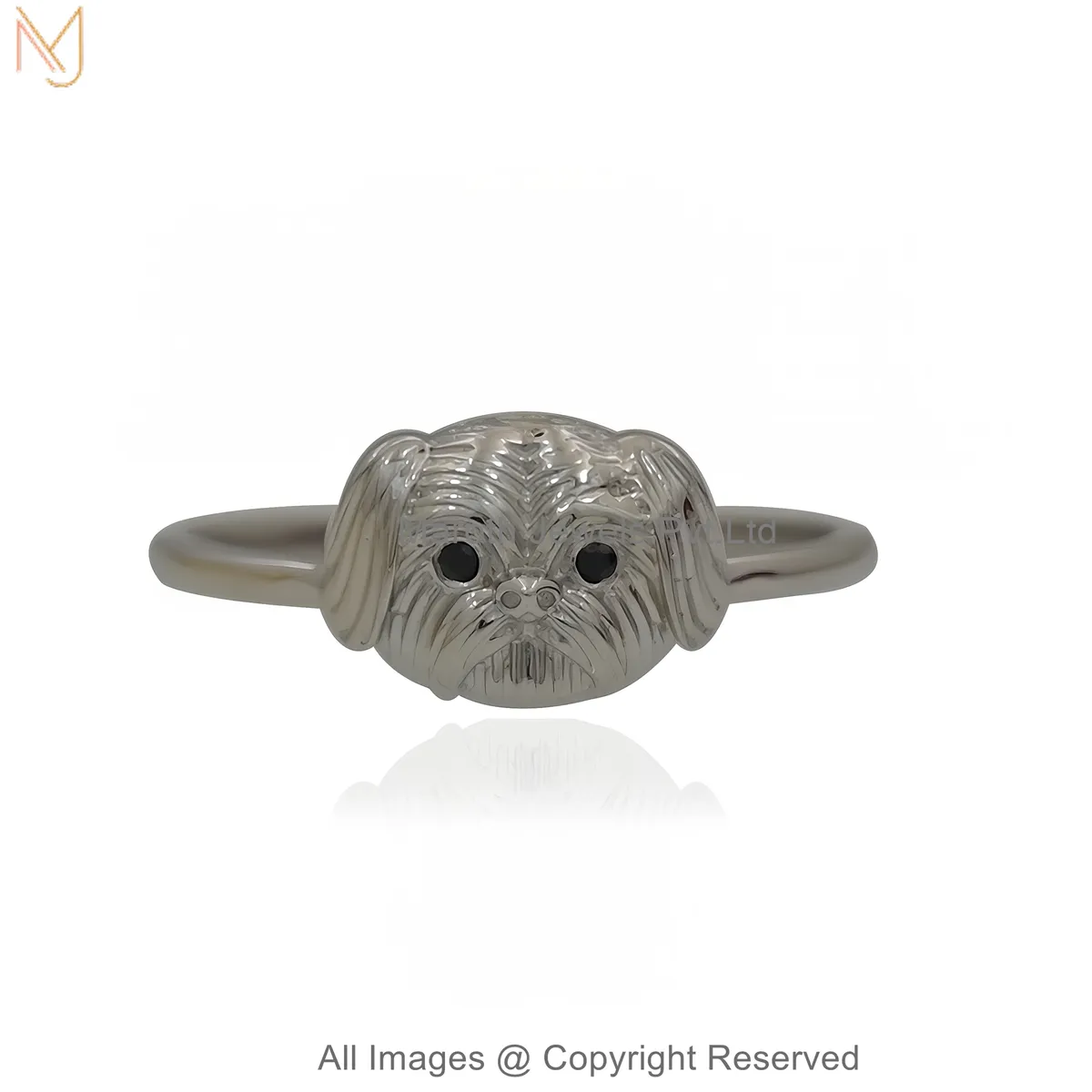 925 Sterling Silver White Gold Plated Black CZ Luxe Shih Tzu Puppy Face Ring Jewelry Supplier