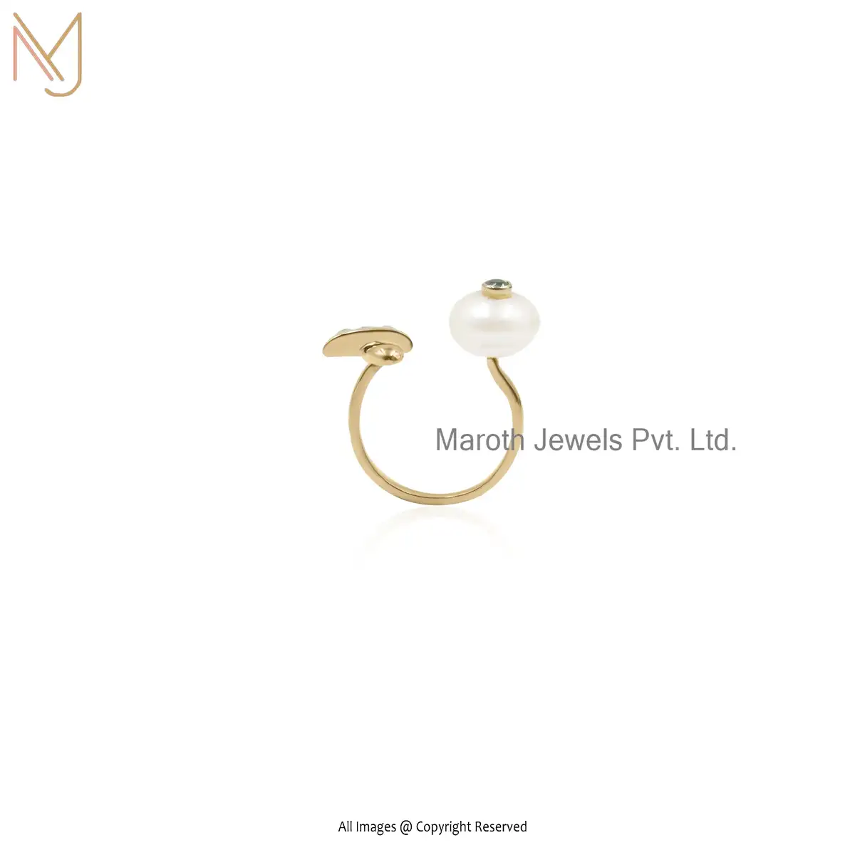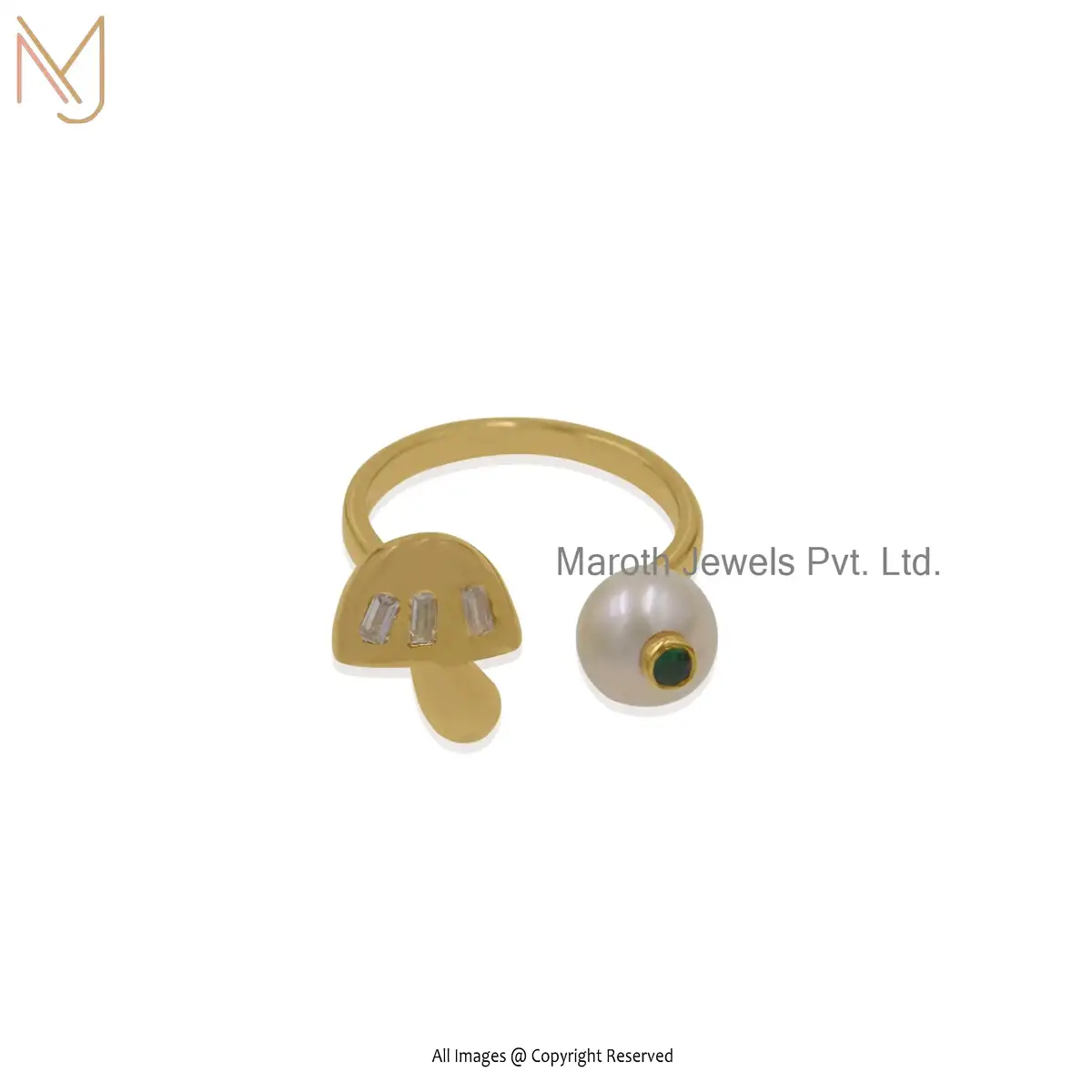 Private Label 14K Yellow Gold White Topaz Baguettes & Emerald or Pearl Mushroom Cuff Ring