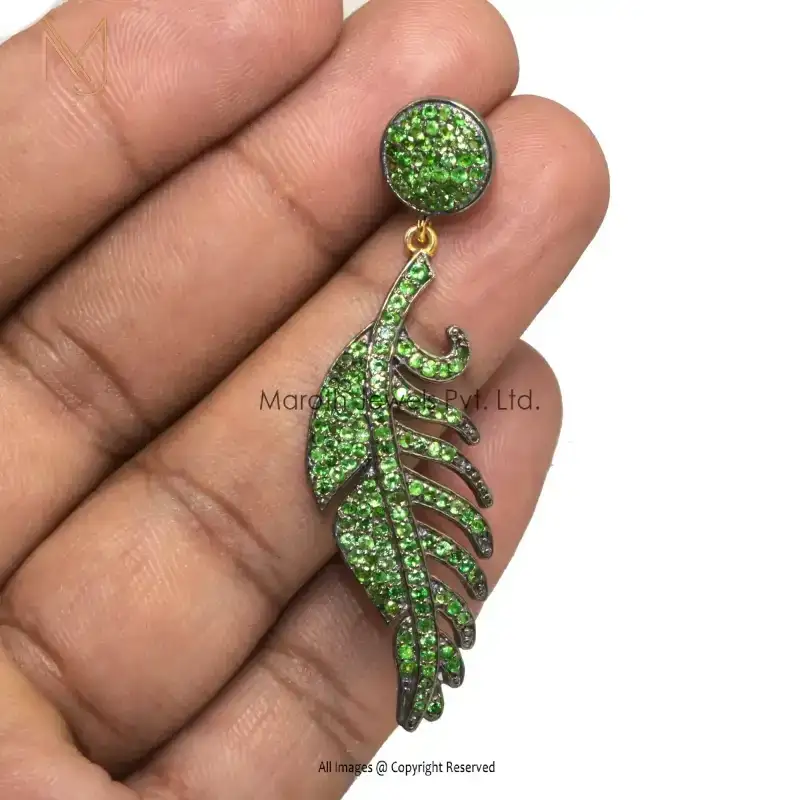 Private Label 925 Silver Pave Micron Setting Tsavorite Gemstone Leaf Drop Earring Jewelry