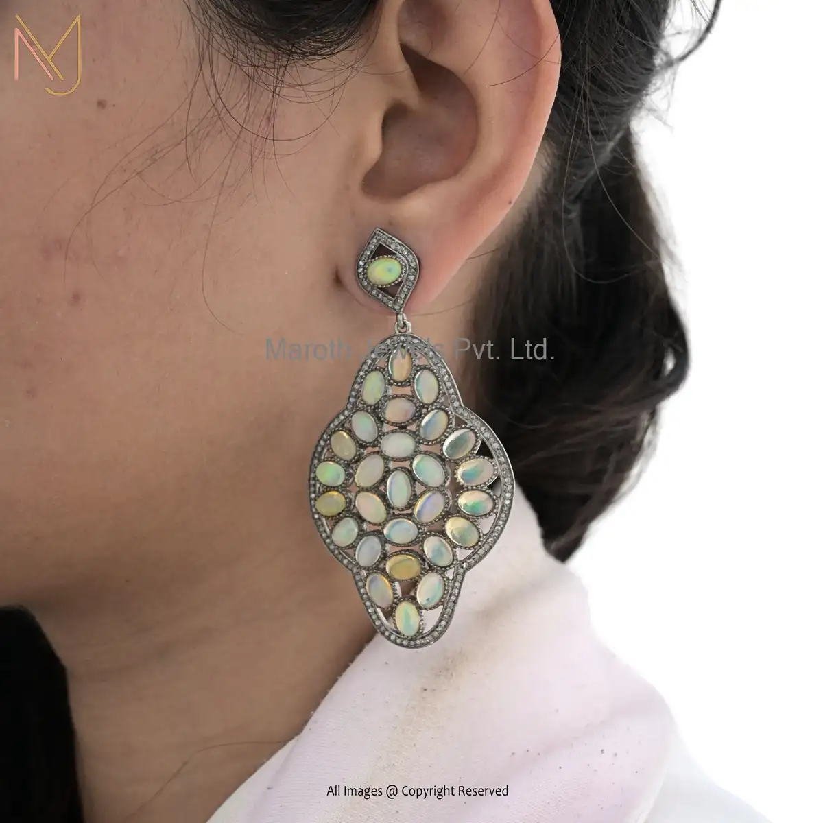 Private Label 925 Silver Rhodium Opal and Diamond Dangle Earring
