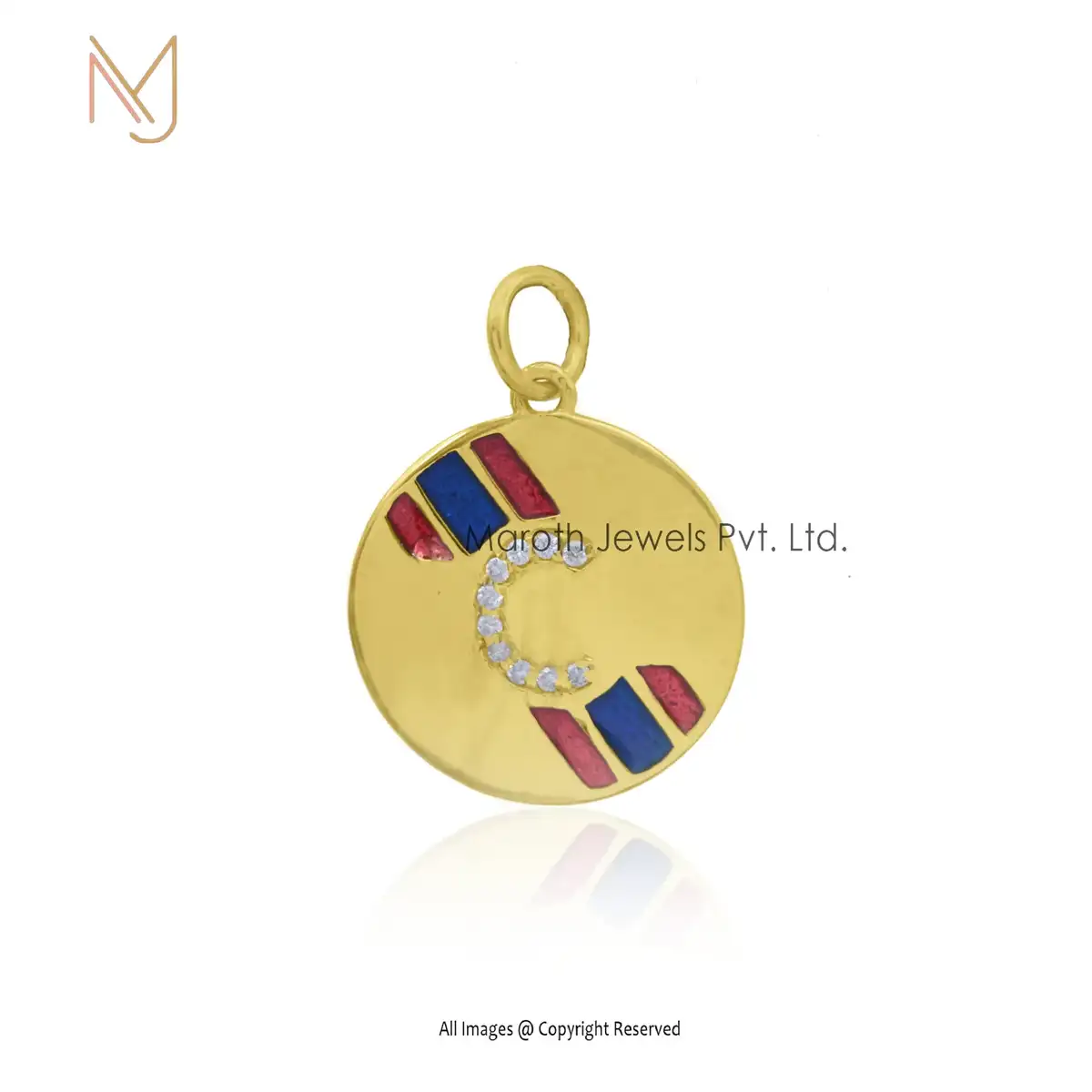 Private Lable 14K Solid Yellow Gold Pave Diamond Red And Blue Enamel C Initial Monogram Pendant Jewelry