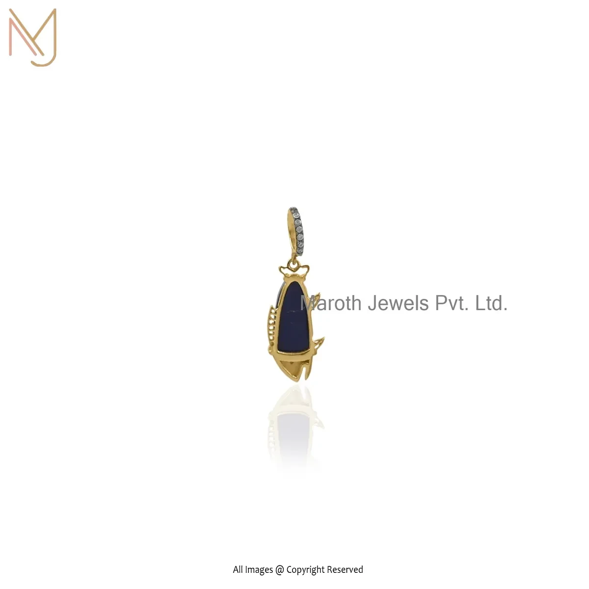Private Lable 14K Yellow Gold Cubic Zircon & Lapiz Lazuli Gemstone Fish Charm Pendant