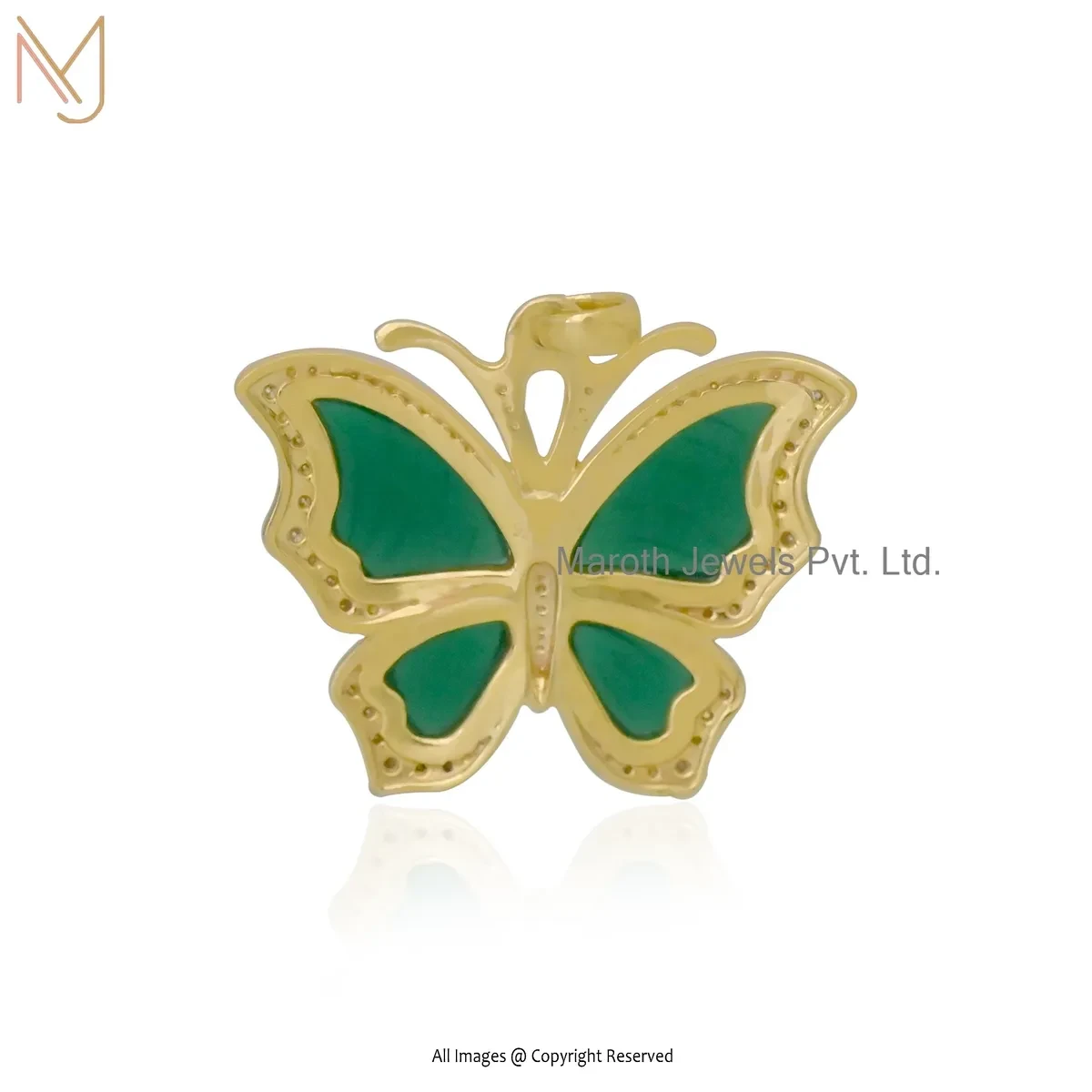 Private Lable 14K Yellow Gold Green Agate And Moissanite Butterfly Pendant