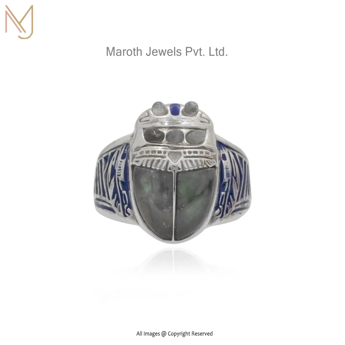 Private Lable 14K Yellow Gold Lapiz Lazuli And Blue Enamel Scarab Ring