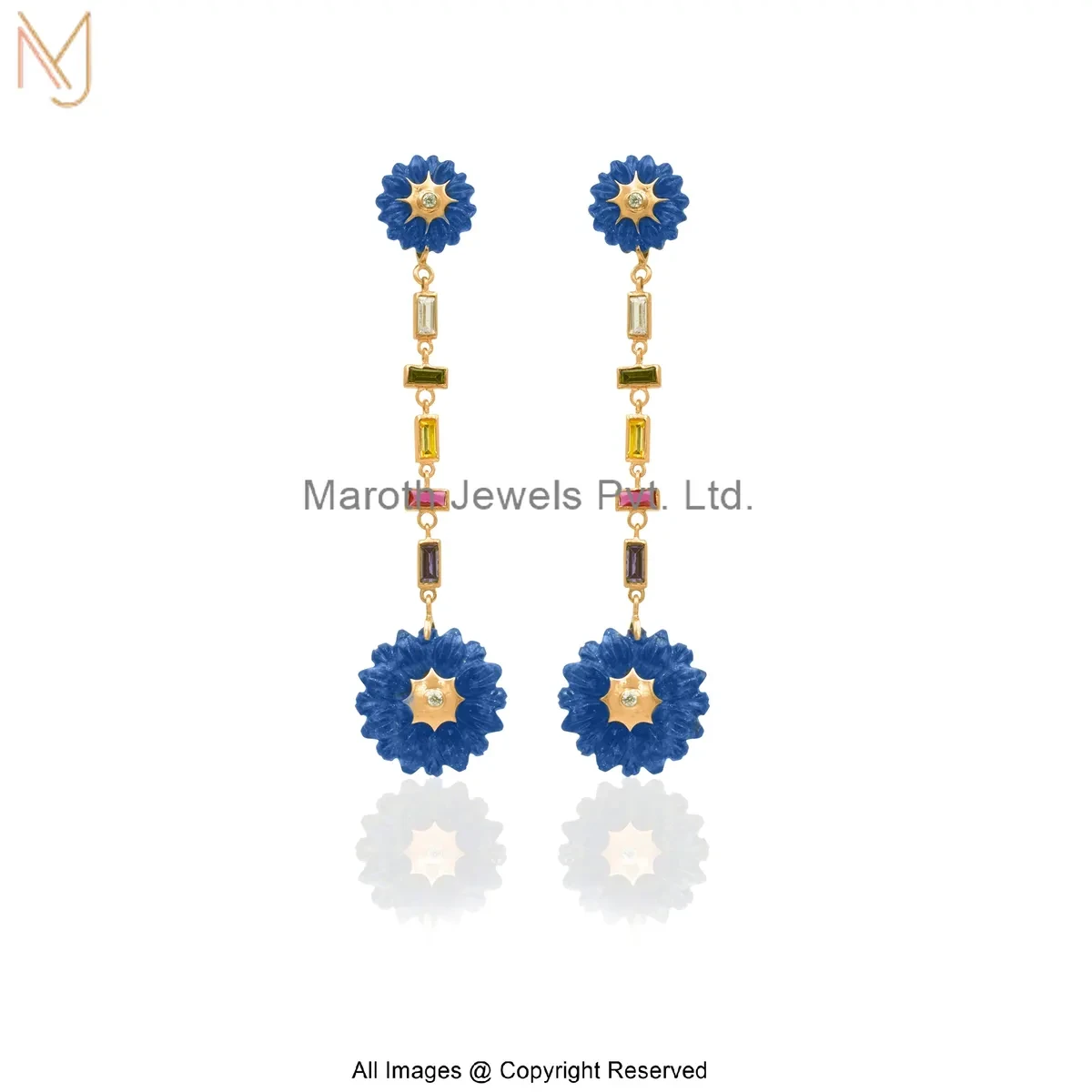 Private Lable 14K Yellow Gold Multi Cubic Zircon Neelkamal Bloom Gemstone Drop Earrings