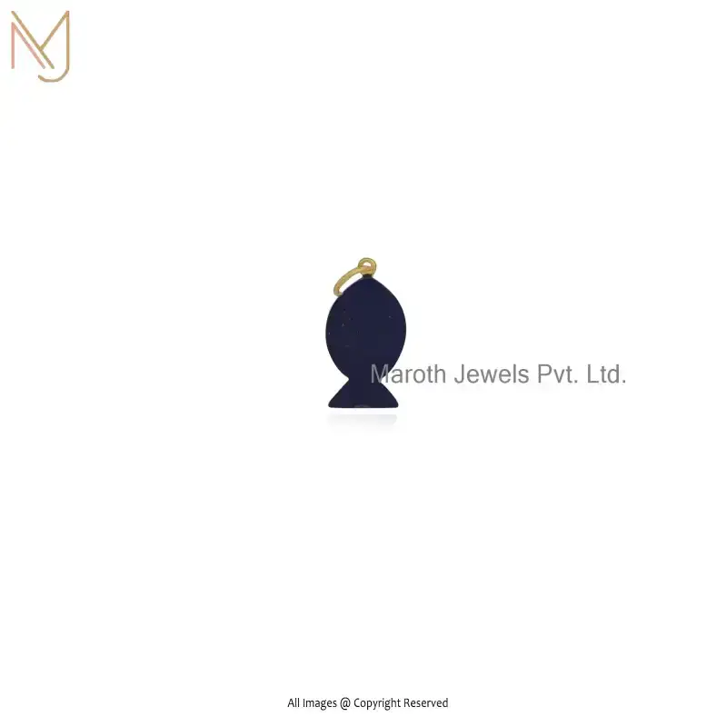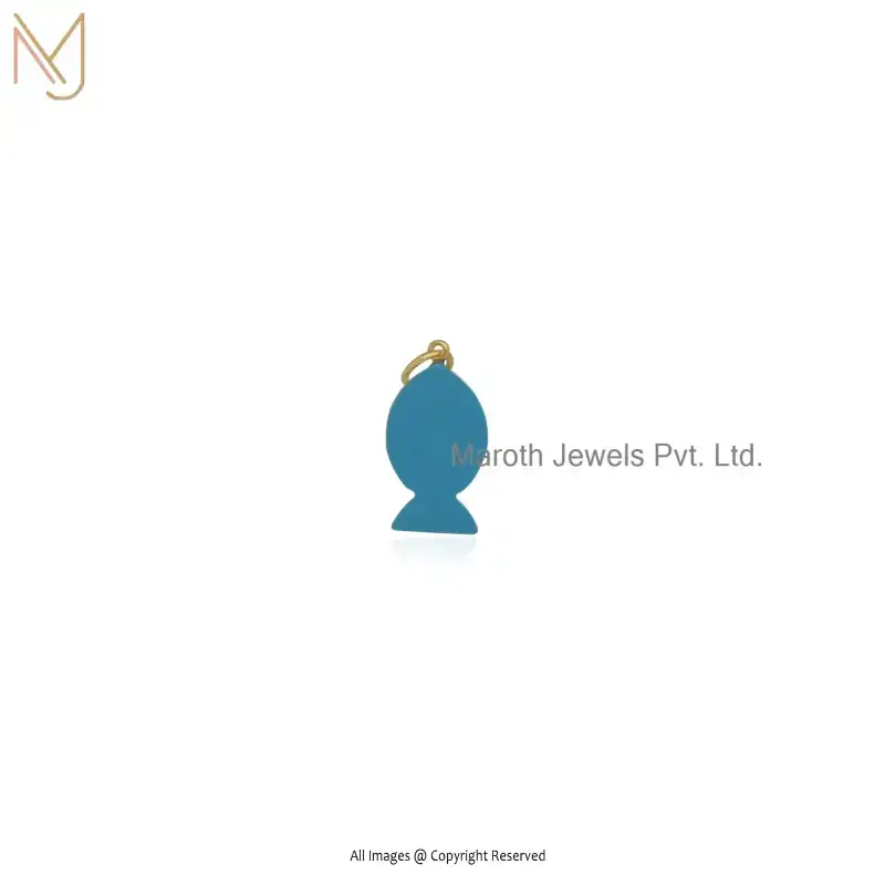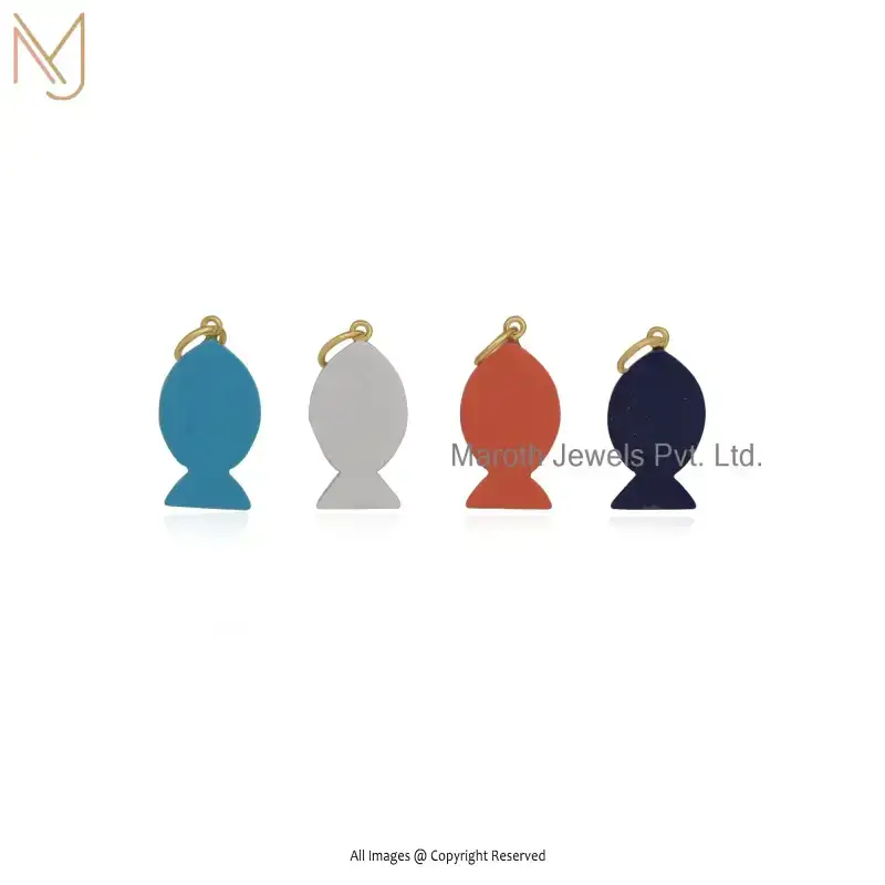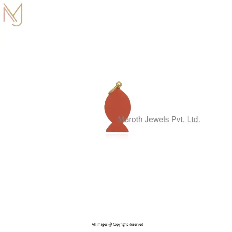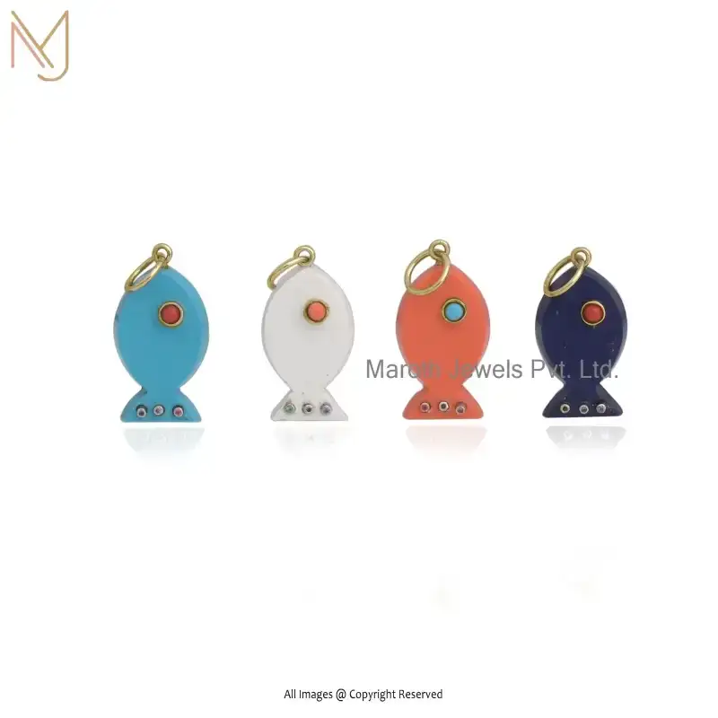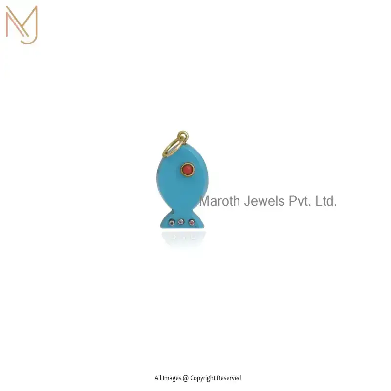 Private Lable 14K Yellow Gold Orange Coral & Turqouise Multi Gemstone Fish Pendant