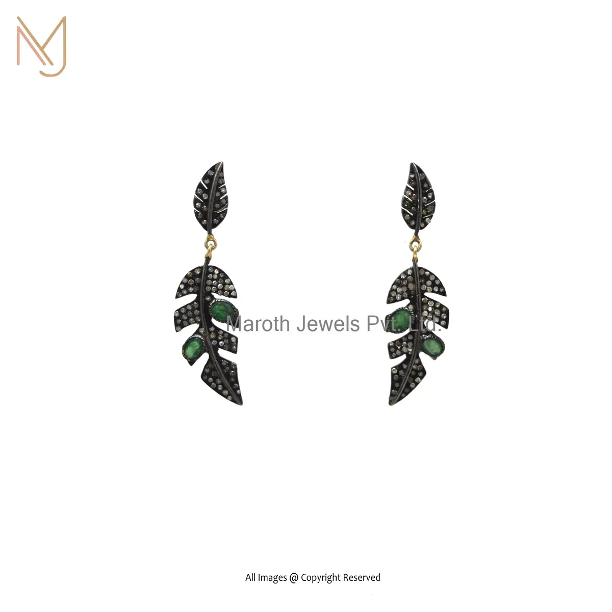 Private Lable 14K Yellow Gold Pave Diamond Emerald Gemstone Leaf Style Dangle Earring